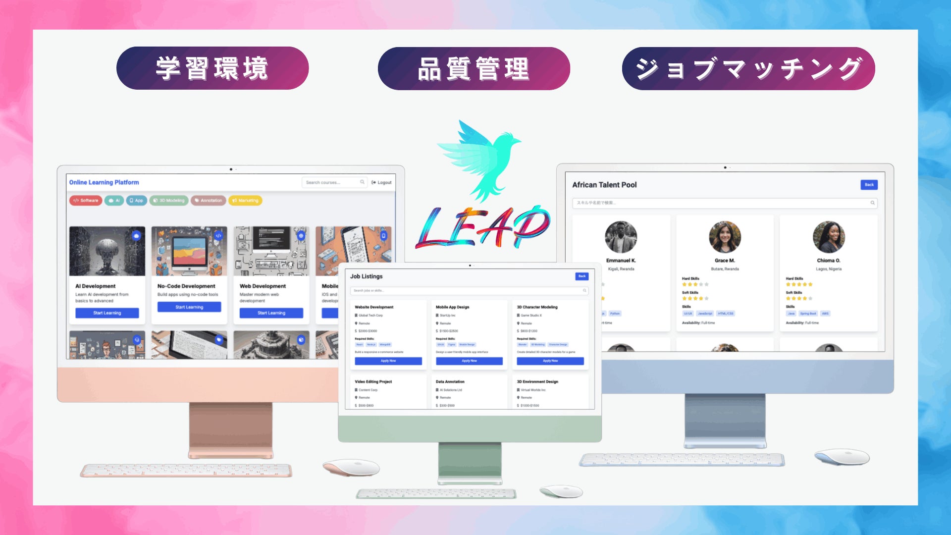 「LEAP」とは、1. 学習管理 2. 品質管理 3. ジョブマッチングを全て可能にするプラットフォームです。「LEAP」により生まれた場所による制限なく、無料でトレーニングを受けるところから、実際の仕事を受けられるまでをフルサポートします。