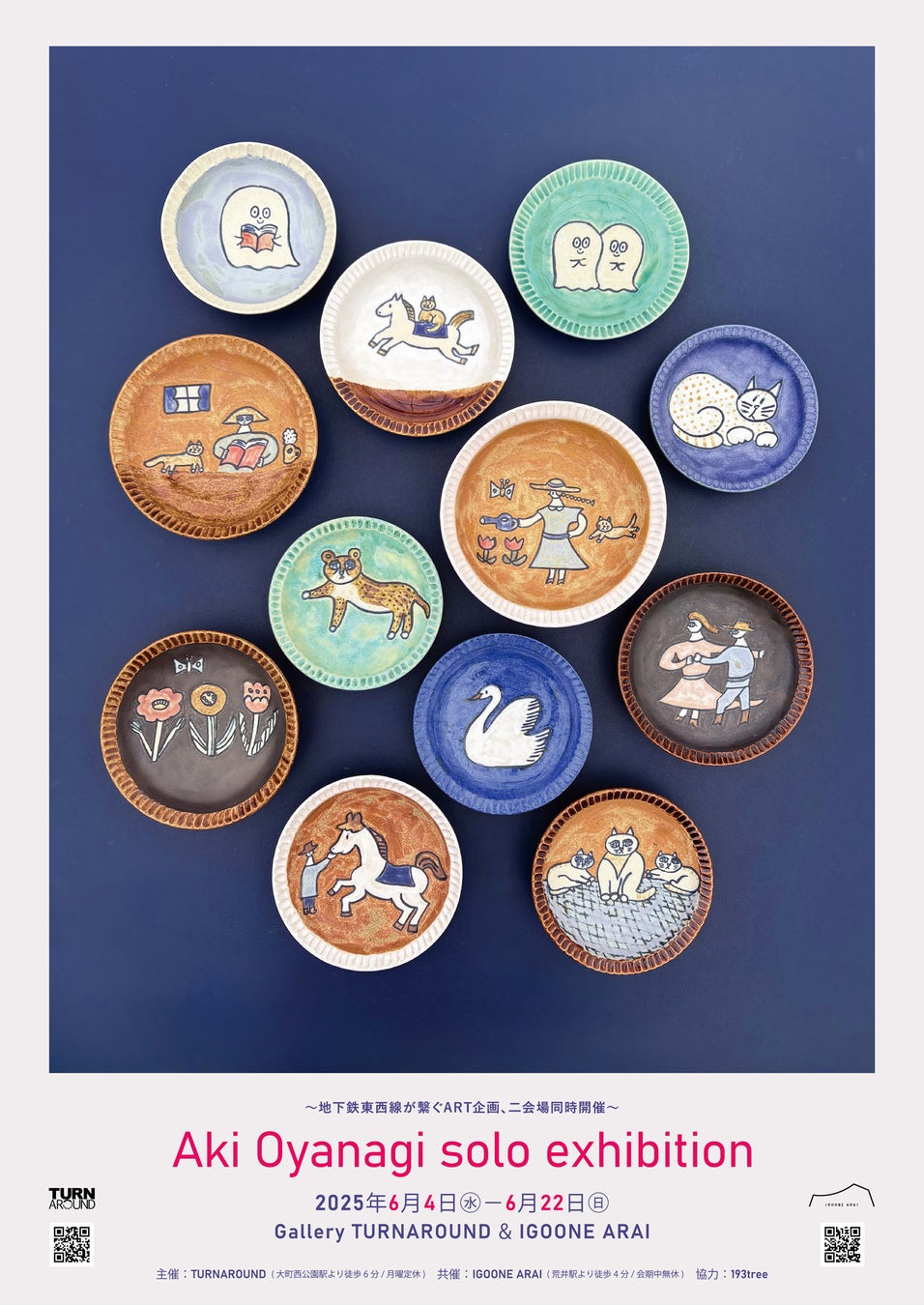 「Aki Oyanagi solo exhibition」では、壁に飾ることもできる絵皿を中心に、作家がロクロで成形し、素焼きをせずに、釉薬で一点一点丁寧に絵を描き入れた愛らしい作品が並びます。