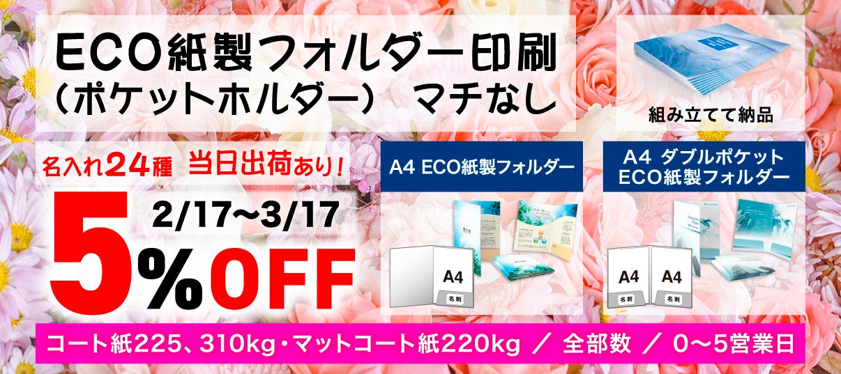 「ECO紙製フォルダー(ポケットホルダー)マチなし」5%OFFキャンペーンを実施する。