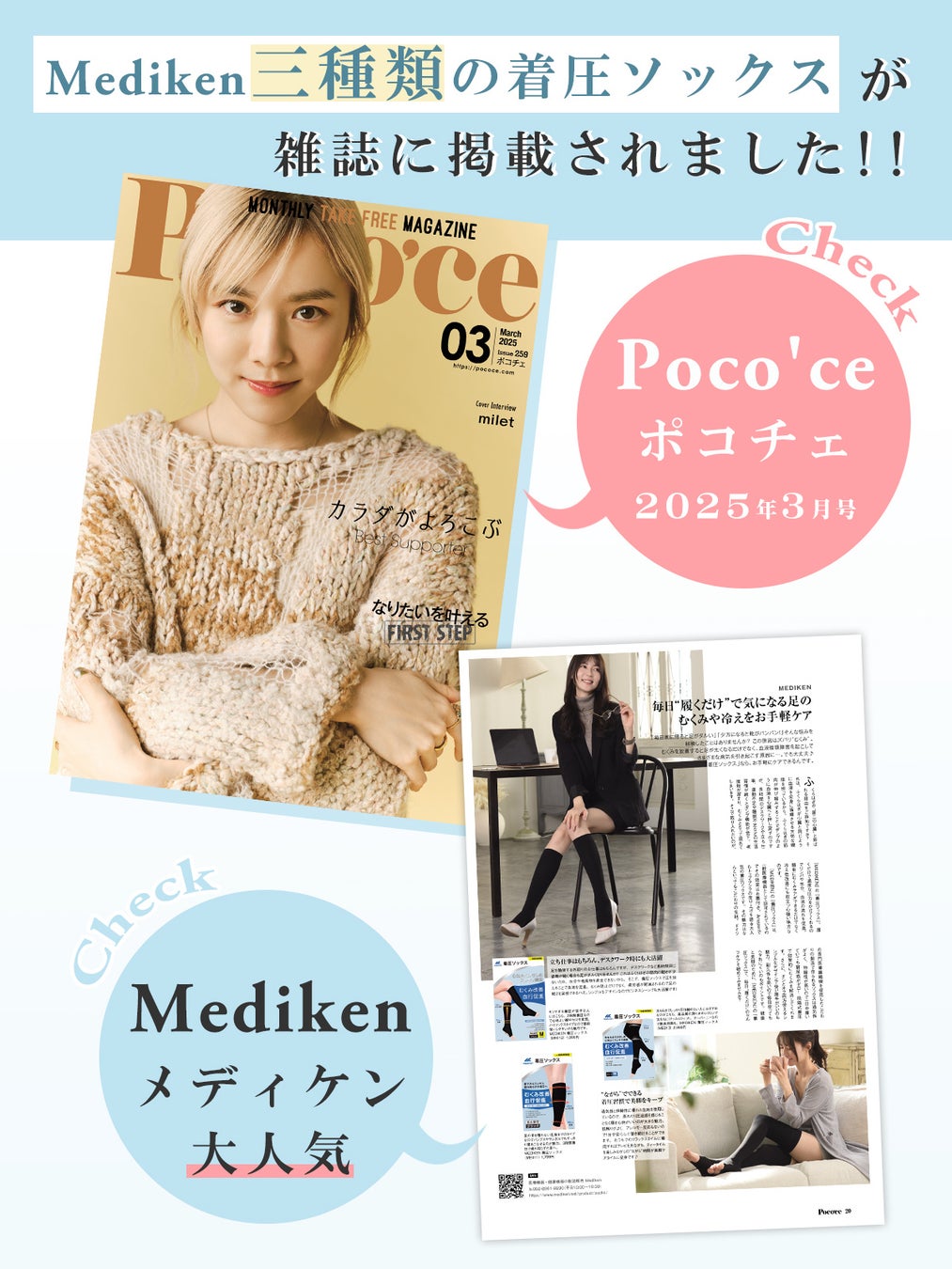「MEDIKEN(メディケン)」着圧ソックスが『Poco'ce(ポコチェ)』2025年3月号にタイアップ企画として掲載!“ながら”でできる着圧習慣で美脚をキープ