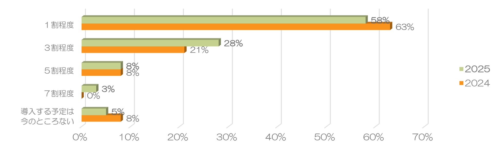 今回のアンケートでは、回答企業の管理部門におけるDX、RPA、AIなどの導入割合は「1割程度」が過半数を占める結果となり、多くの企業がデジタルやAI導入による効率化が途上であることがわかりました。