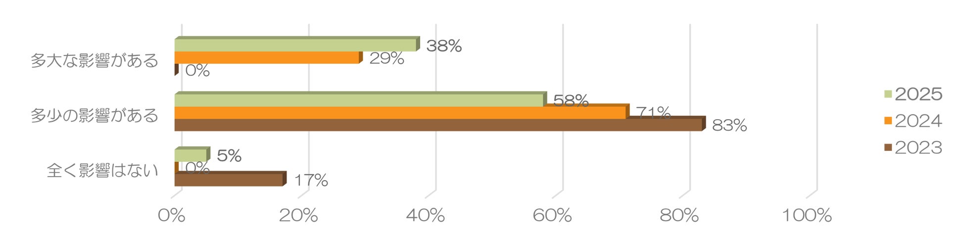 また、昨今の物価高・インフレーションの影響により、「業績に多大な影響がある」と回答した企業が約4割に上昇しており、「多少の影響がある」と合わせると96%もの企業に影響が出ていることがわかりました。今後の関税政策の行方次第では更なる影響が懸念されます。