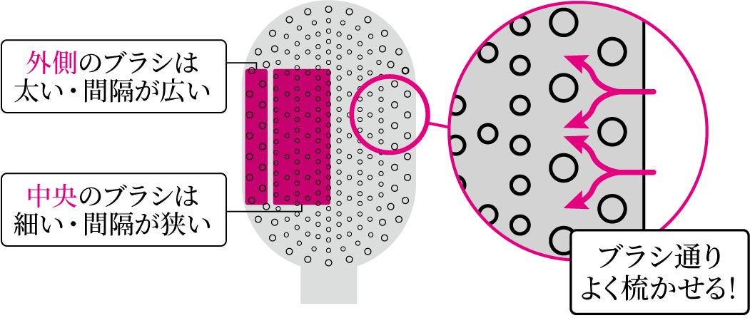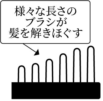 1本1本ブラシの長さや太さ、間隔が違うことで、絡んだ髪をキャッチしやすく、髪の絡まりを解きほぐします。