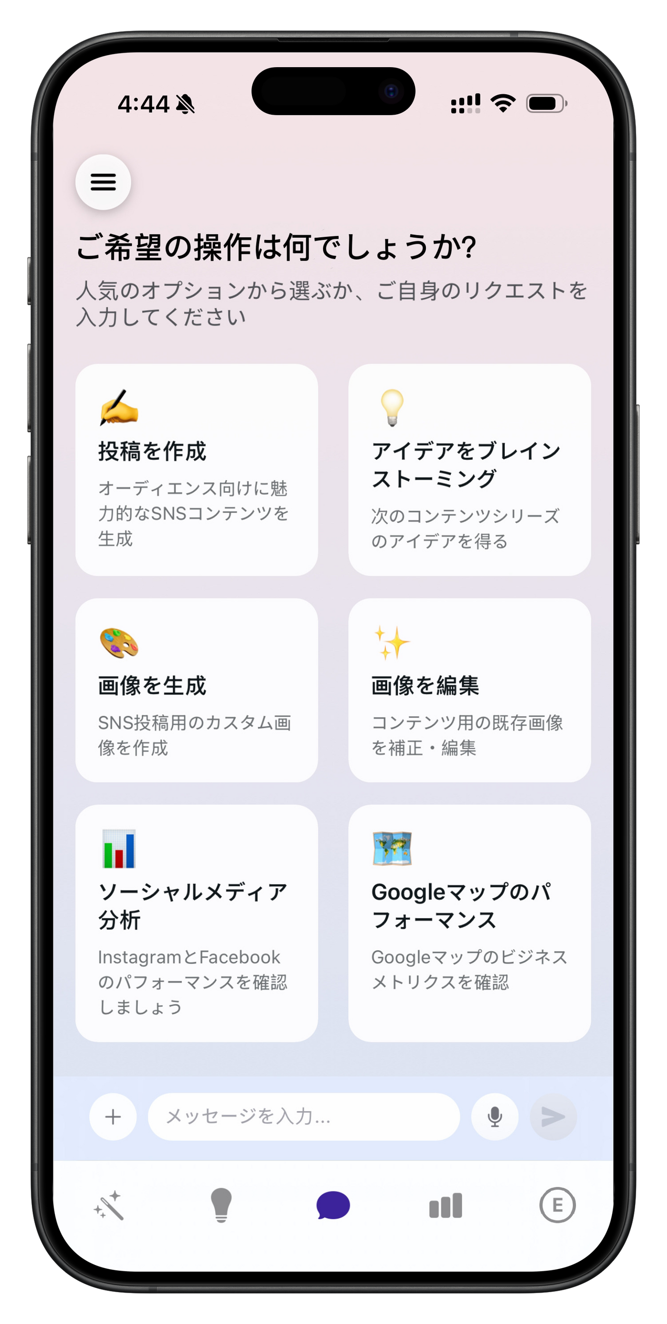 24時間AIアシスタント:コンテンツのアイデア出しから作成まで、あらゆる面をサポートするチャット型AIチームメイトです。パフォーマンスや次のアクションについて、常に最新情報やアイデアを提案します。
