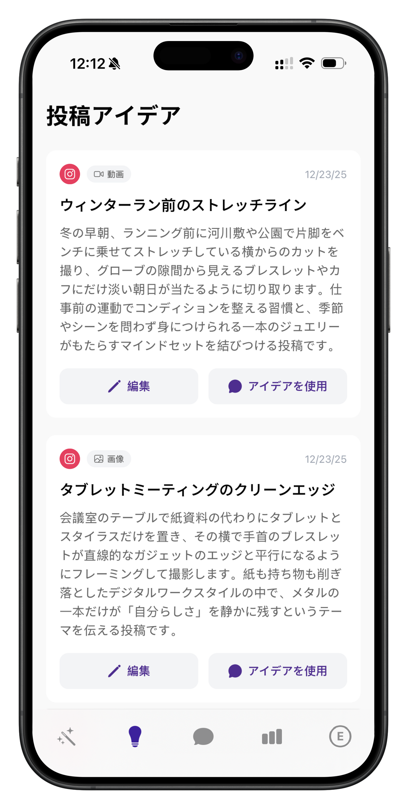 アイデアの提案:ビジネスの状況、直近のアクティビティ、季節のトレンドに基づいて、毎日最新、かつ関連性の高い投稿アイデアを提案します。投稿のネタに困ることが少なくなります。