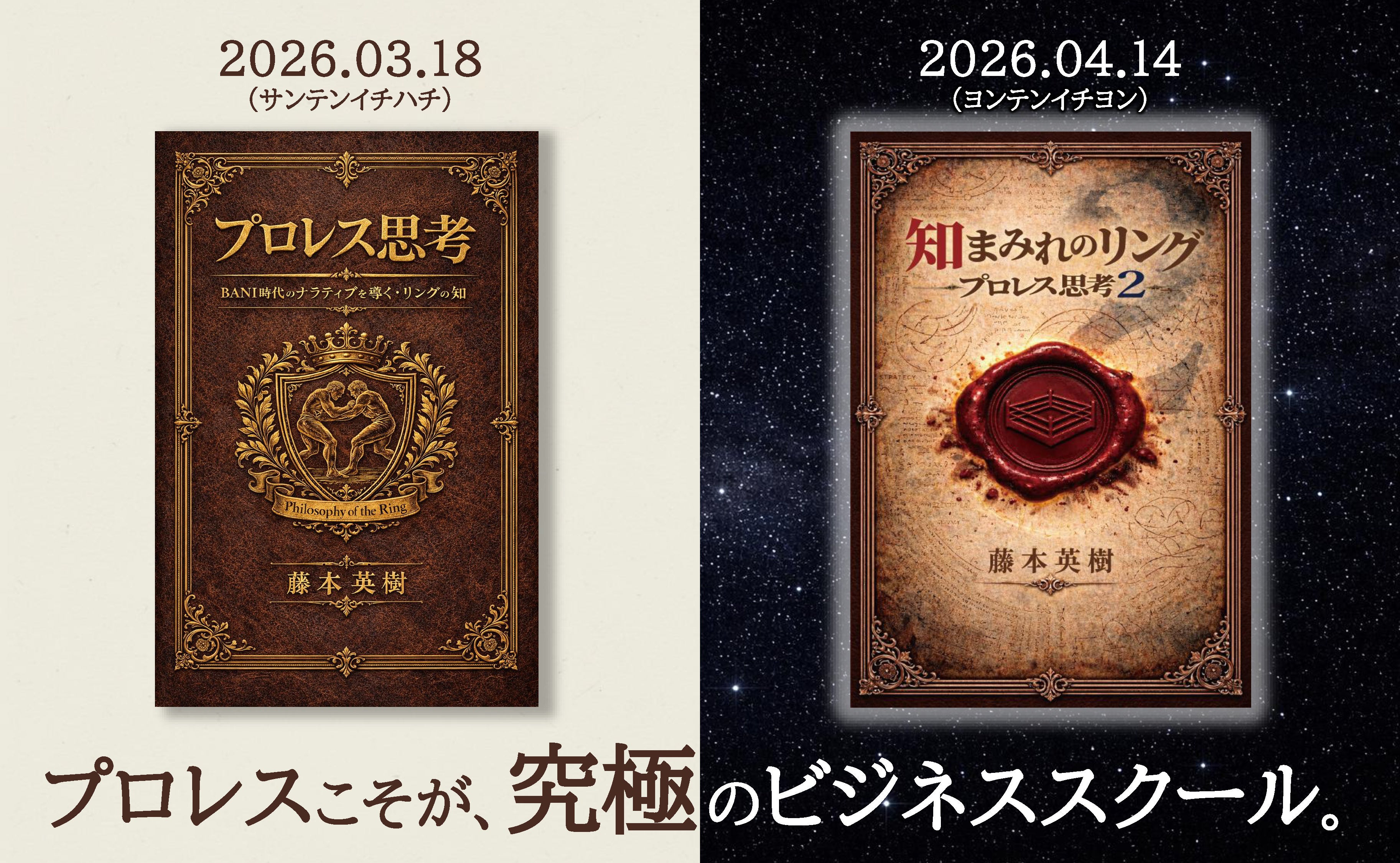 2026年3月18日に刊行された前作『プロレス思考――BANI時代のナラティブを導く・リングの知』が、ビジネスリーダーの間で予想を上回る反響を呼び、好評を博しています(Amazon売れ筋ランキング最高4位:現代思想部門)。この熱狂を受け、BBドライビングフォース株式会社(東京都中央区)代表の藤本英樹は、当初半年後を予定していた続編の刊行を大幅に前倒しし、シリーズ第2弾を緊急出版いたしました。