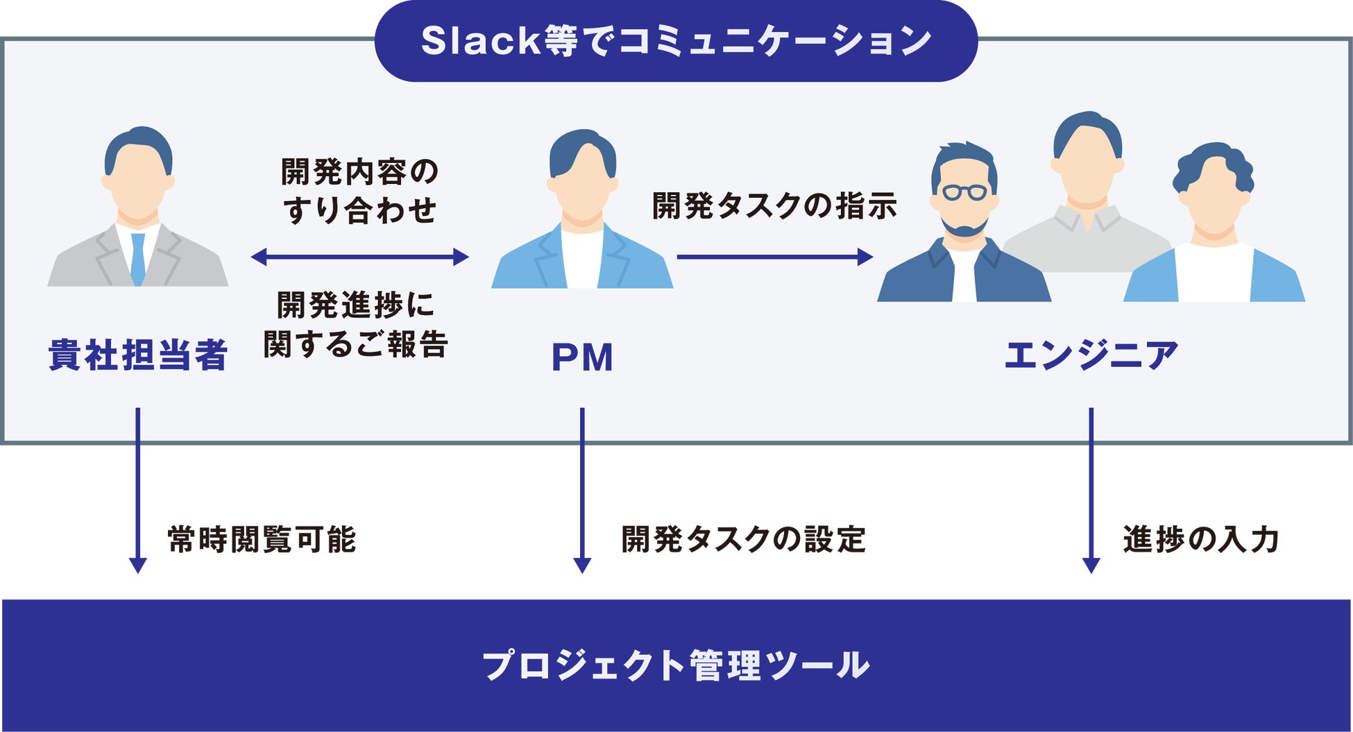 当社では貴社担当者が進捗を把握しやすいよう、プロジェクト管理を行います。通常のラボ型開発では貴社担当者で行うべき発注業務の整理について、当社PMにて実施しタスク/スケジュールへの落とし込みを実現します。