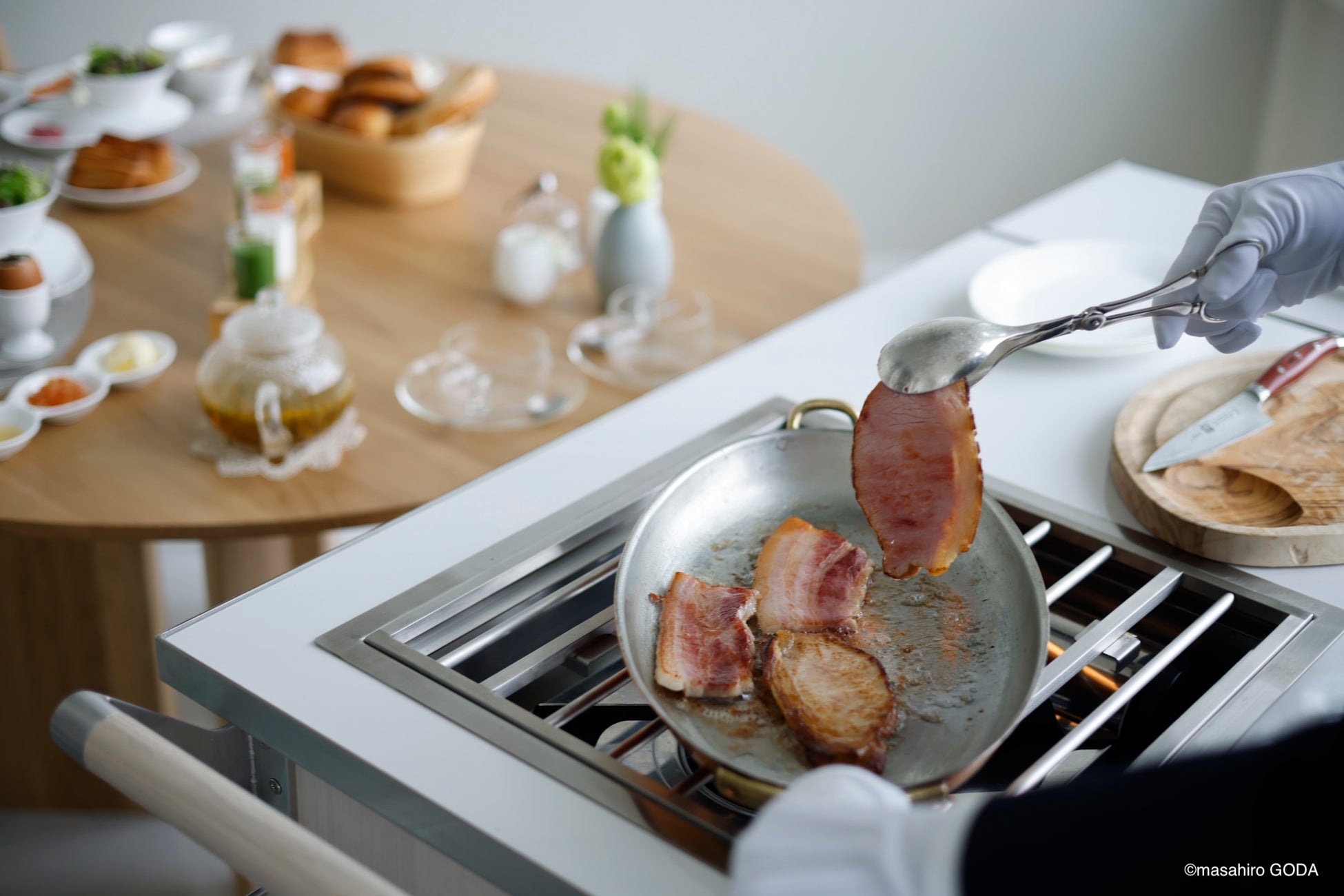 夕食は、北の大地へのオマージュを込めた、蝦夷鮑のヴァプールやブイヤベース、蝦夷鹿のパイ包み焼き‟a la Maria Callas“など、四季折々の美食とワインとのマリアージュがお楽しみいただける「Main Dining 白夜」、または、北海道が育む豊かな“EZO前”の粋が堪能できる「すし処 船見」からお選びいただけます。翌日の朝食は、陽光あふれるメインダイニングにて、瑞々しい地元の野菜や果物、ハム、ベーコンなどをたっぷりと。一日の活力が体に漲ります。