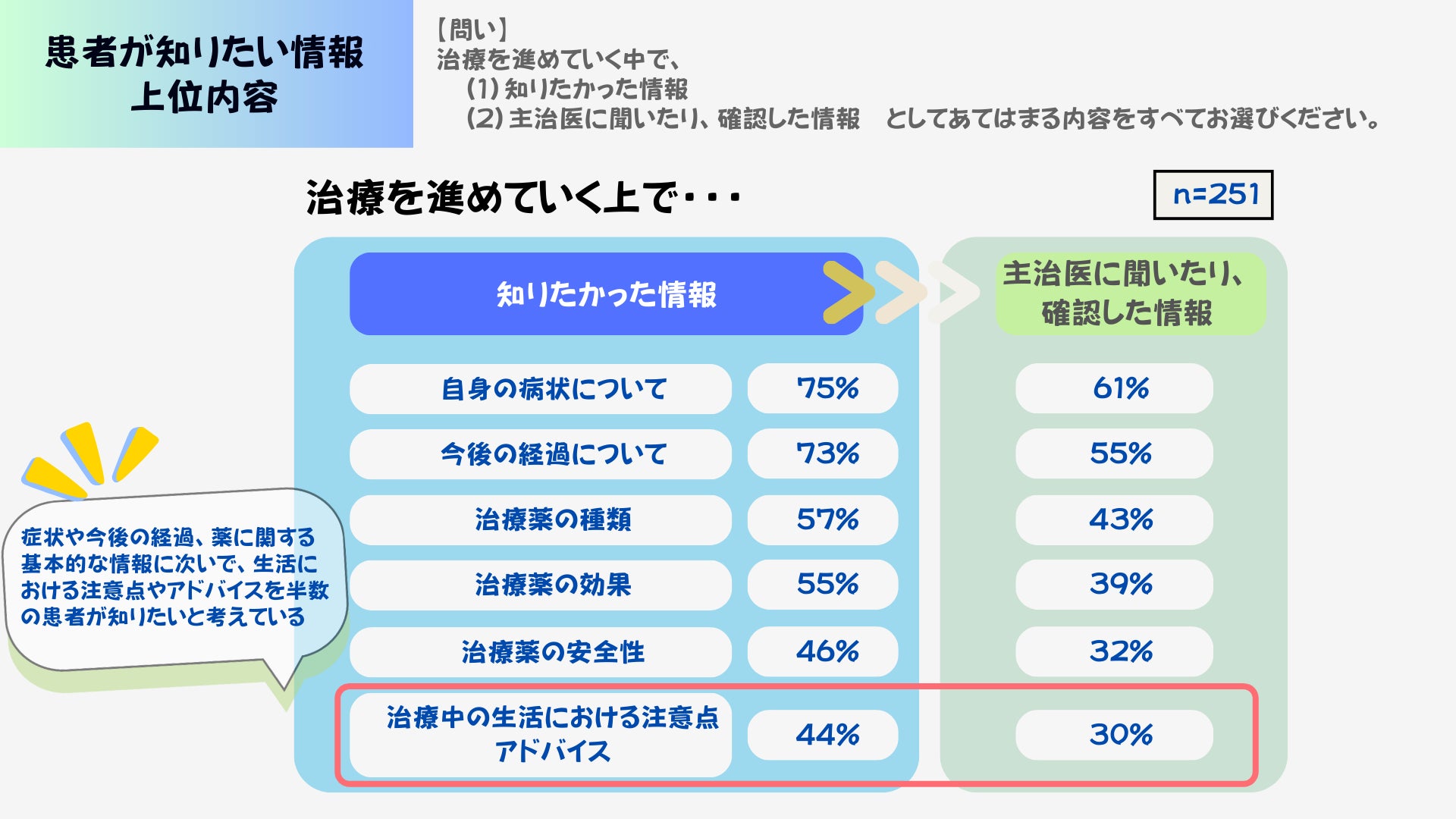 患者が治療を受ける上で知りたいこととしては、自身の症状や今後の経過、治療薬の種類や効果、副作用などに加え、「治療中の生活における注意点やアドバイス」について知りたいと考える人が半数程度いることがわかりました。
