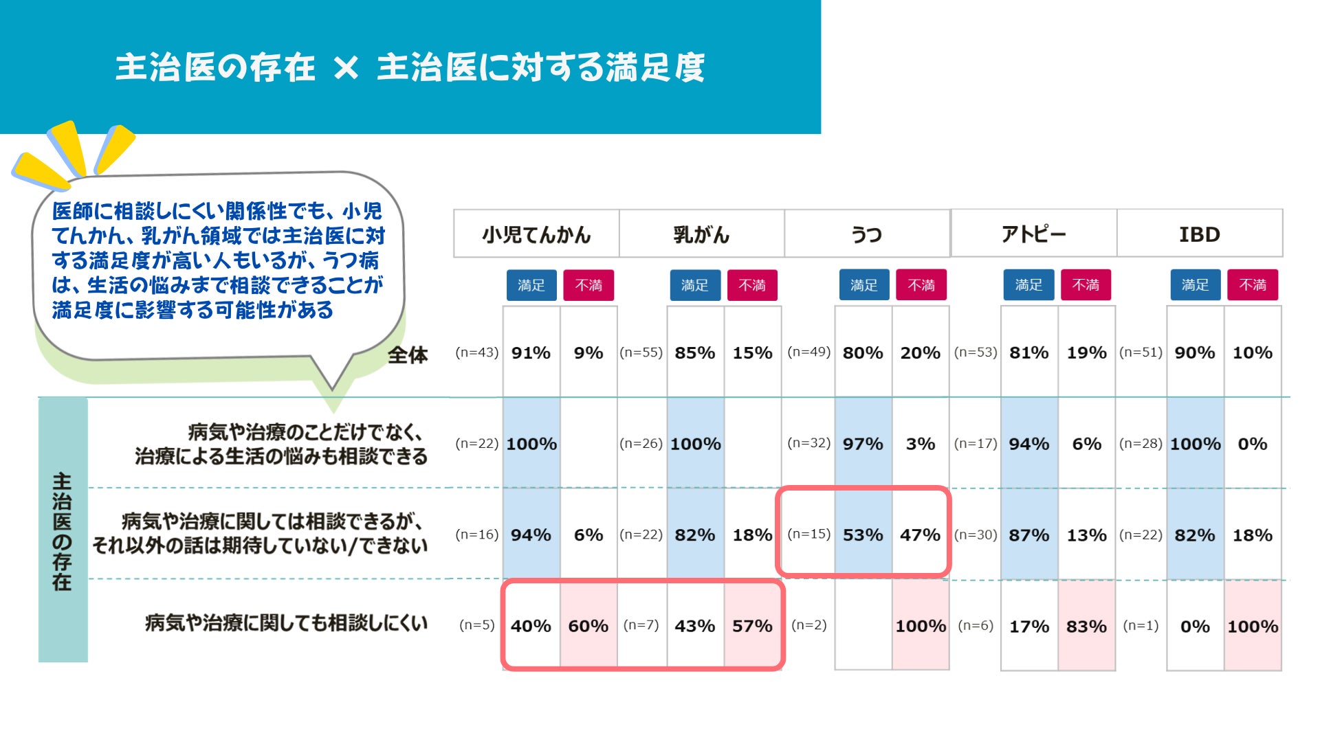 さらに、主治医との関係性(主治医の存在)に着目すると、「治療による生活の悩みまで相談できる」患者ほど主治医への満足度が高く、反対に、そこまで相談できていない患者では満足度が低い傾向が明らかとなりました。