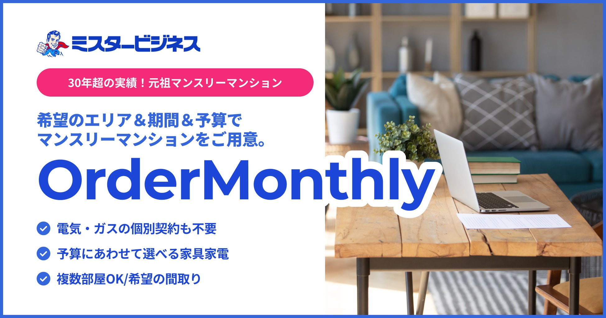 全国のマンスリーマンション・ウィークリーマンションの検索・予約サイト「ミスタービジネス(https://www.mrb.co.jp)」(運営:株式会社泉ハウジング、本社:茨城県神栖市、代表取締役:今泉政直)は、法人向け住まい手配サポートサービス『オーダーマンスリー』の受付を拡大。