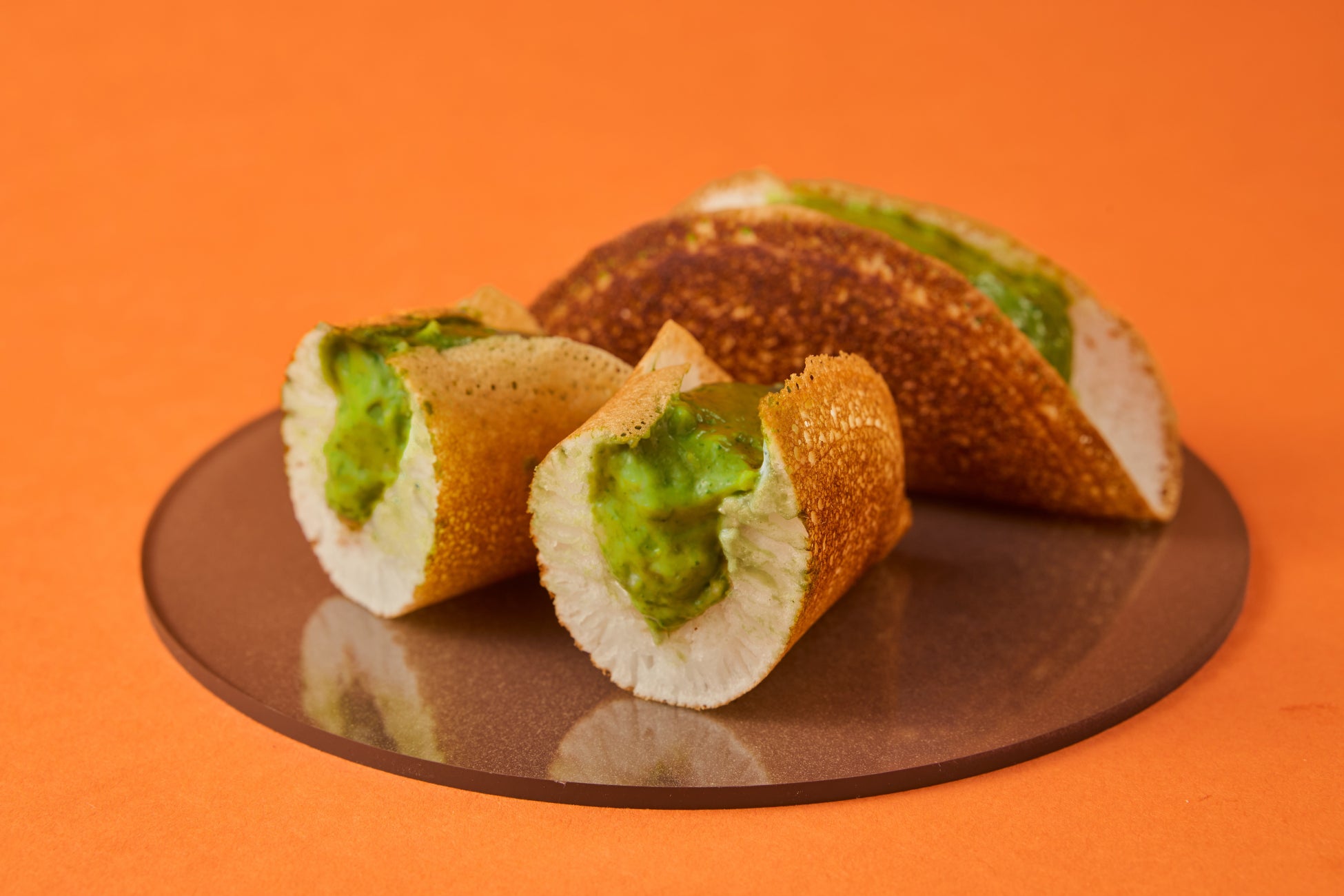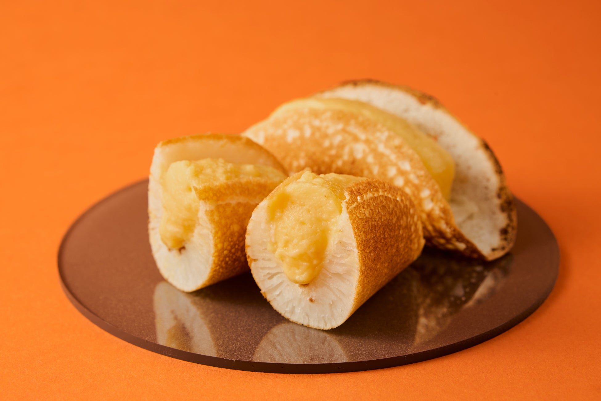 特別な焼き方で、外はカリッと香ばしく、中はふんわり&もっちりの新食感を実現。 -