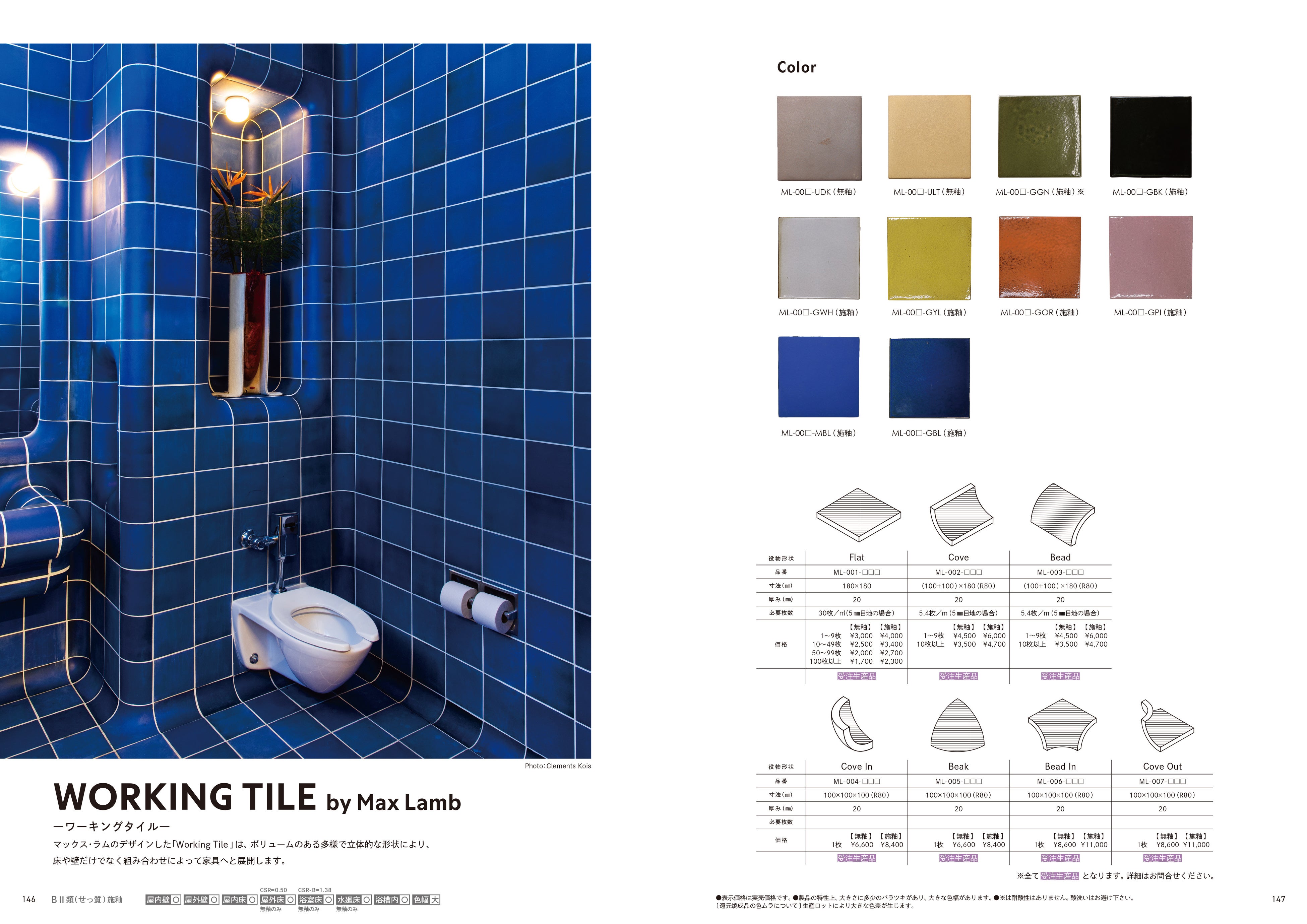 新ブランド/デザイナー協働:カタログ初登場のブランド「Tajimi Custom Tiles」より、 デザイナーとの協働で生まれた「Working Tile (by Max Lamb)」や「Ori (by Ronan Bouroullec)」など、素材の表情と造形の自由を追求したシリーズを掲載。