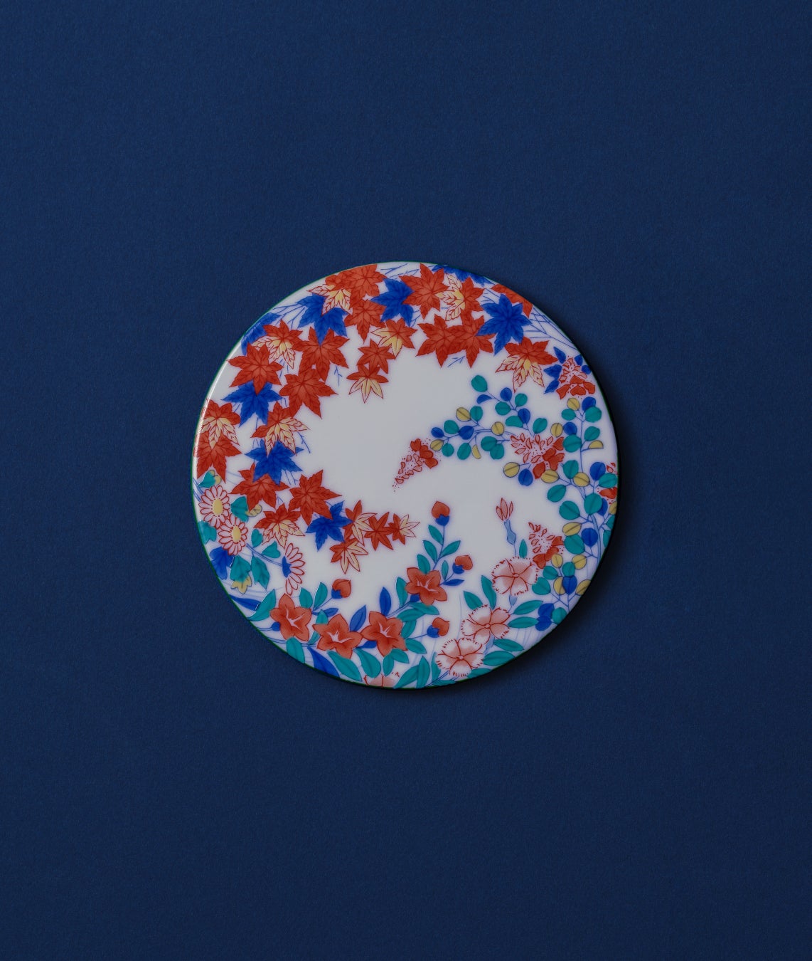 秋の絵皿では、「感謝と希望、秋の花」をテーマに、成熟と静けさを湛える「紅葉」、思いやりの心を映す「萩」、誠実な愛を誓う「桔梗」、高貴さと真実を示す「菊」、可憐な純愛を語る「撫子」という、秋を象徴するモチーフを描いています。