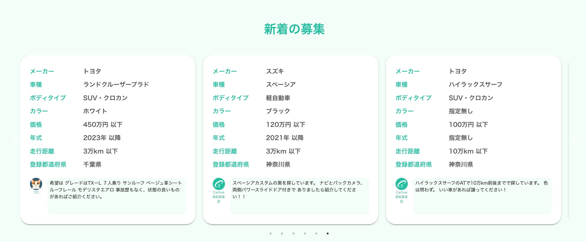 また、既存の中古車情報サイトは「売りたい車」を並べることが主流であり、「買いたい人」のニーズが埋もれがちでした。