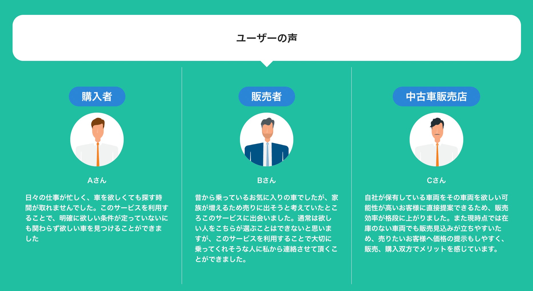 「欲しい人に直接提案できるので、販売効率が格段に向上。在庫がなくても販売見込みが立ちやすい」(Cさん・中古車販売店)