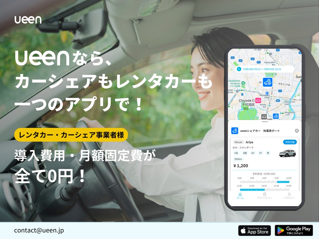ueenは、ユーザーがレンタカーとカーシェアを同じアプリで探せて、予約から貸出、返却までの手続きを一つの流れで完了できる体験を、月会費無料・距離料金無料で提供します。あわせて事業者向けには、取引手数料のみの固定費ゼロで導入できる料金体系を採用し、小さく始めて需要に合わせて伸ばせる環境を整えます。さらに、レンタカー/カーシェアを同じ管理画面で一元運用できる仕組みを提供し、複数拠点の管理にも対応します。加えて、カーシェア導入に必要な準備(キー関連の取り付け等)や手続きのフルサポート、免許・体制が未整備の場合でも提携事業者とのマッチングにより、立ち上げまでを後押しします。