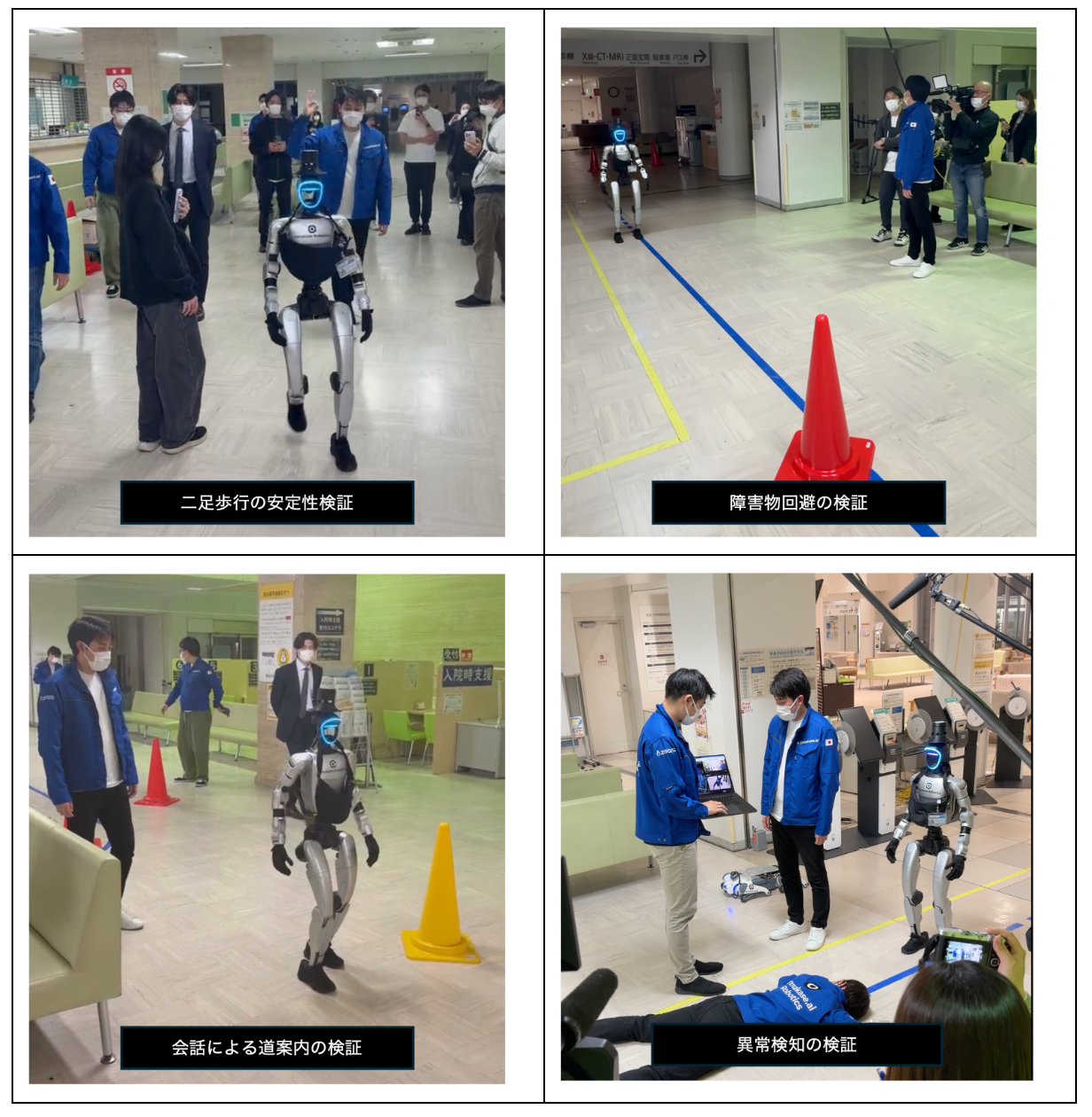 主な検証内容は、病院内の床環境における歩行安定性の確認、カラーコーンや歩行者等を対象とした障害物回避、「エントランス→採血室」などを想定した目的地までの自律歩行、物品の運搬、ならびに関係者向けデモンストレーションおよびフィードバック収集です。