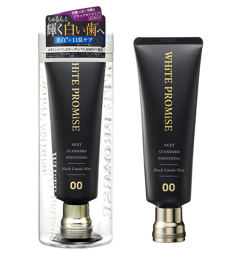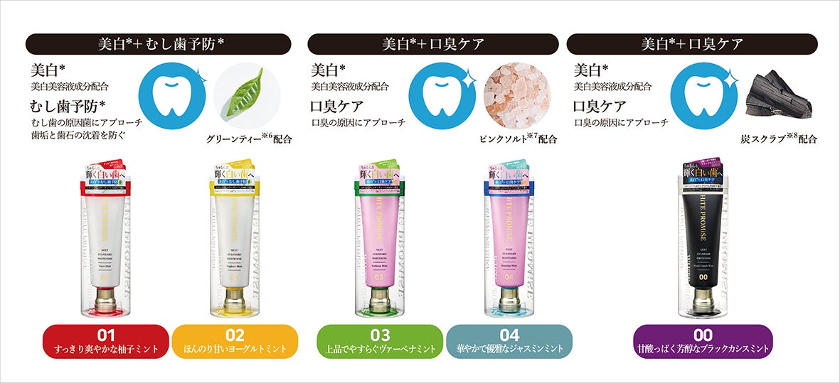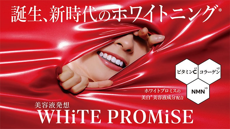 美容液発想の美白*歯みがきで、美容液成分や先進成分として注目されているビタミンC※¹、コラーゲン※²、NMN※³を贅沢に配合。「美白*+むし歯予防*」、「美白*+口臭ケア」の2タイプでお客様の悩みにお応えしていきます。コスメを連想させるパッケージと使う度に気分が上がる5種のフレーバーで、いつもの歯みがき習慣をもっと楽しく、素敵な体験に変えていきます。「WHiTE PROMiSE(ホワイトプロミス)」は、自信に満ちた笑顔を約束します。