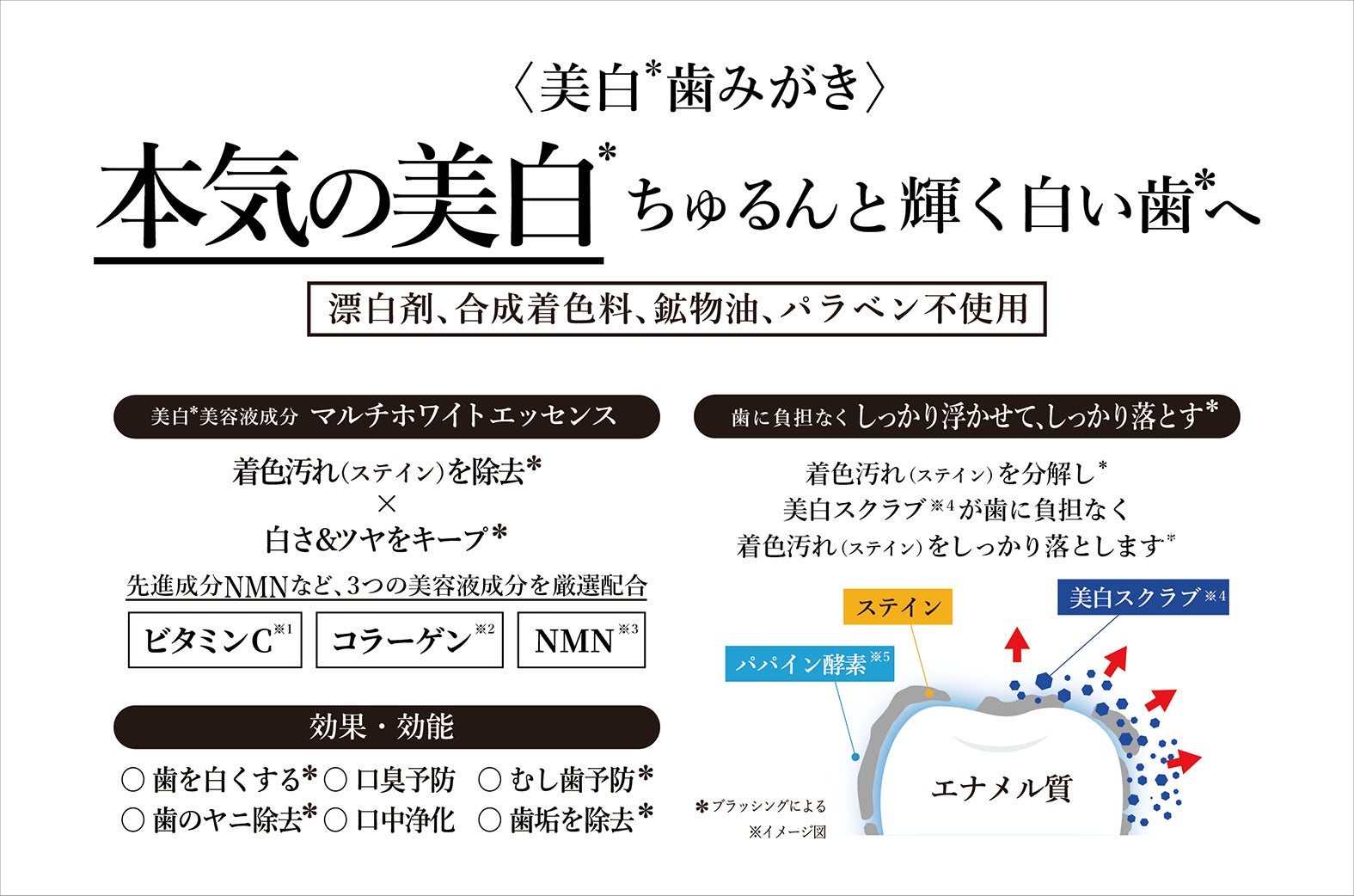 *ブラッシングによる、 ※1アスコルビルリン酸Na(製品の酸化防止剤)、※2水溶性コラーゲンクロスポリマー(湿潤剤) ※3ニコチンアミドモノヌクレオチド(湿潤剤)※4シリカ(清掃剤)、※5パパイン(清掃剤)、※6チャ葉エキス(湿潤剤)、※7塩化Na(口腔ケア剤)、※8炭(吸着剤)