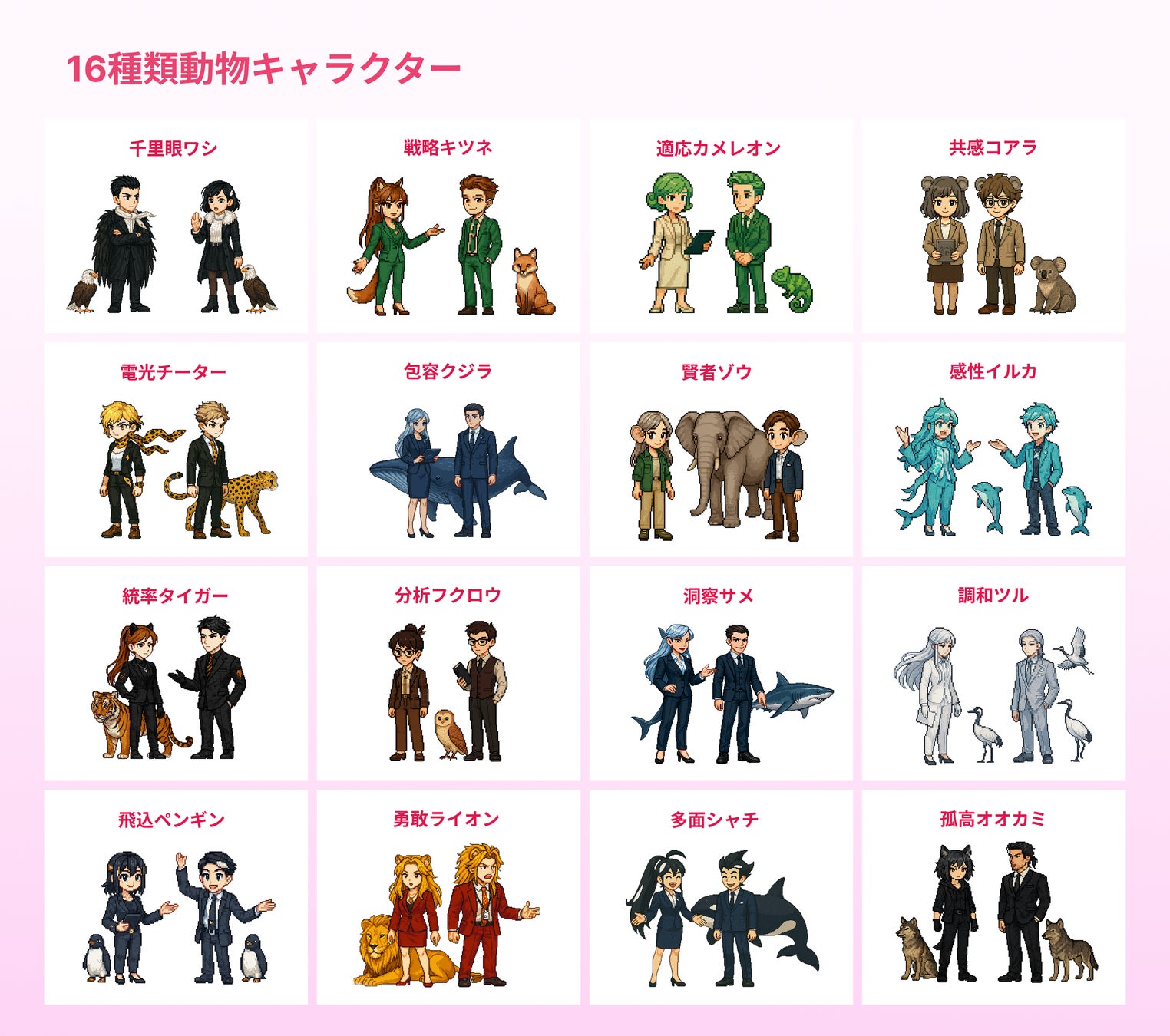 千里眼ワシ / 電光チーター / 共感コアラ / 洞察サメ / 包容クジラ / 分析フクロウ など