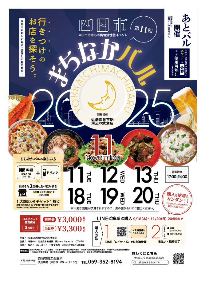 ■「四日市まちなかバル」について 忘年会シーズン前の四日市の街を舞台に、様々なお店の「はしご」を楽しんでいただく食べ歩き・飲み歩きイベントです。知らなかった名店との出会いや、お気に入りのお店の再発見を通じて、四日市の新たな魅力を体感していただくことを目指しています。