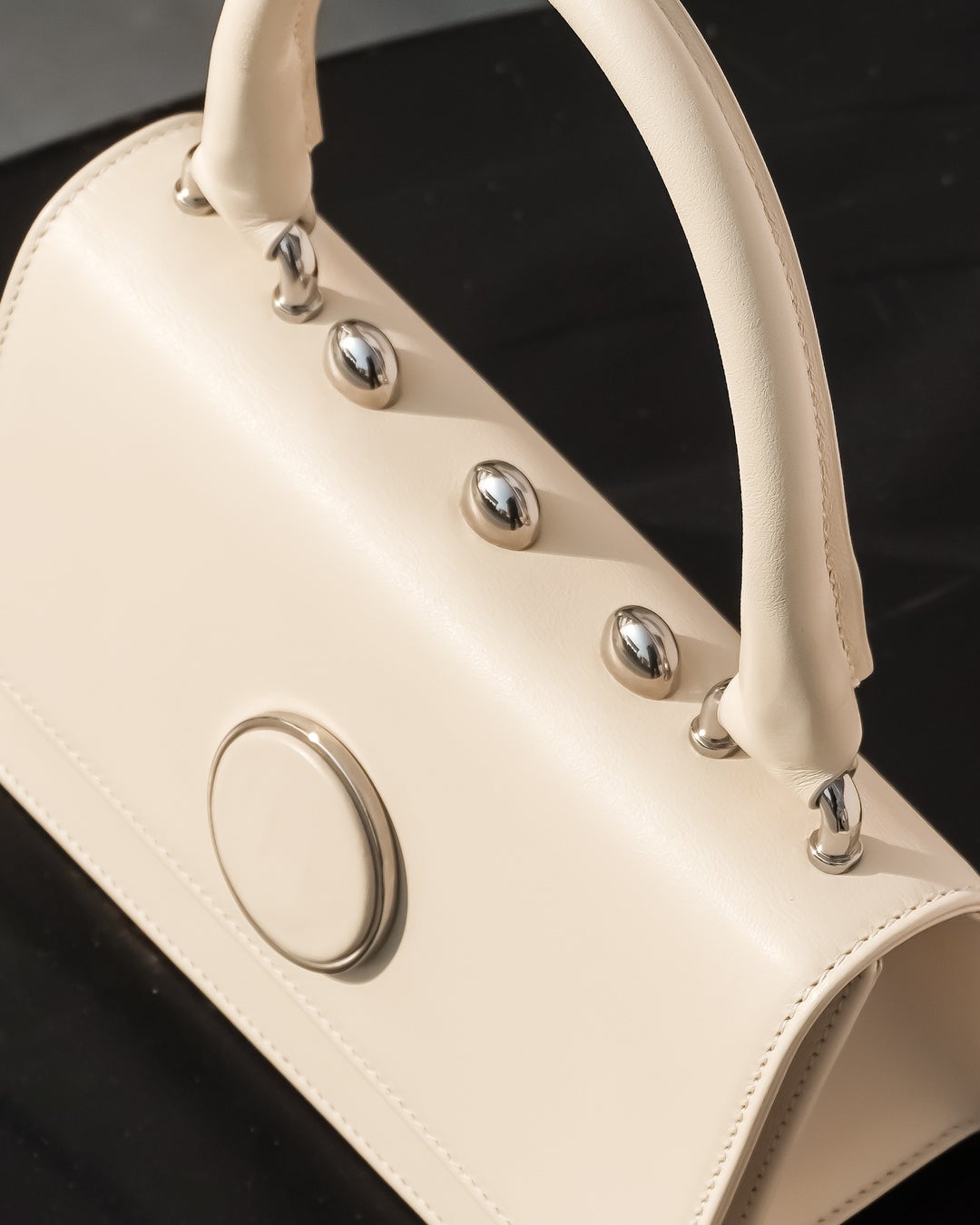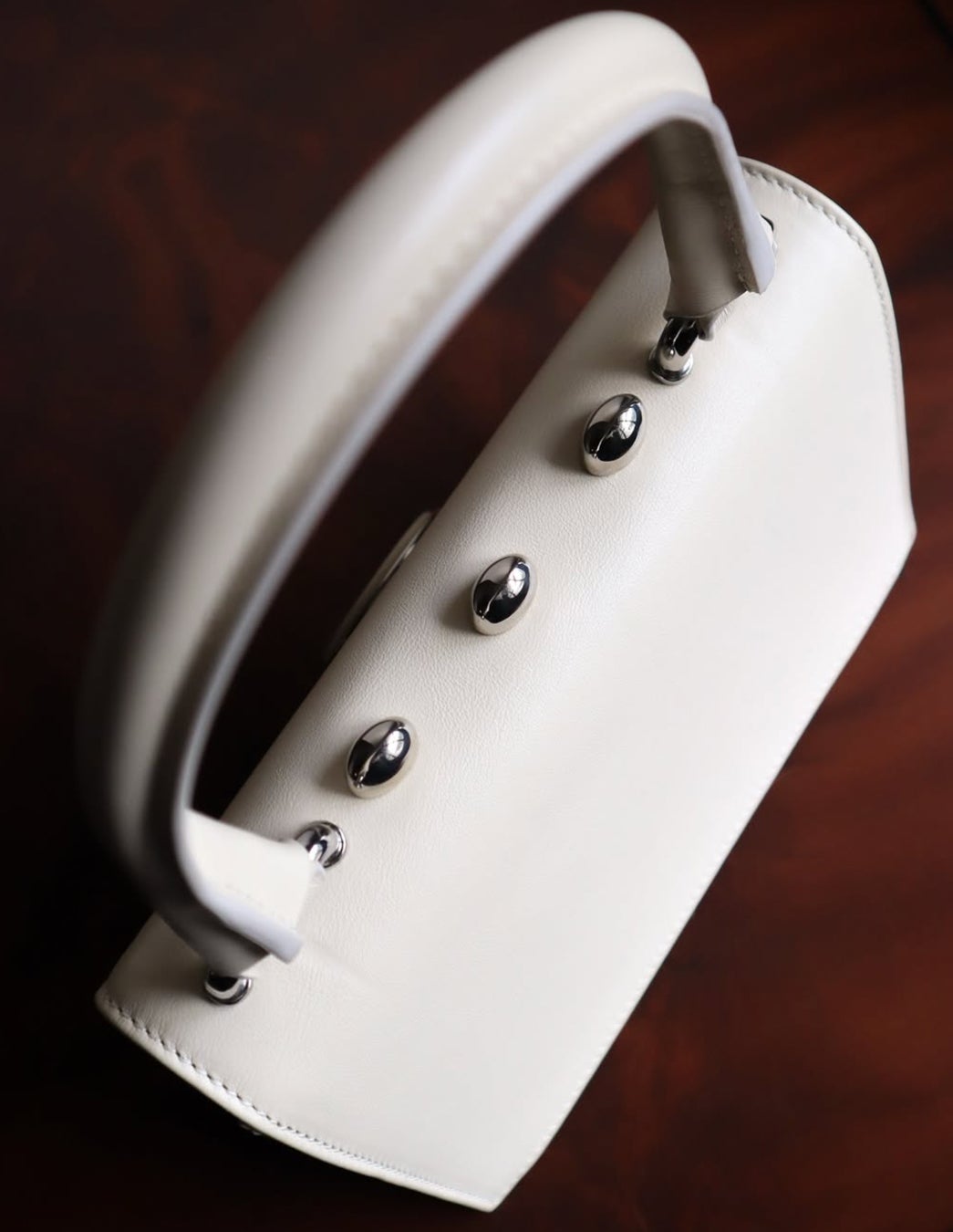 アンブラバッグは、マリーナ・ロレンツィのエクスクルーシブコレクションの中心を成しており、エレガンスと大胆さが融合したコンテンポラリーデザインを体現しています。シャープな幾何学的ラインに円形のスタッズや装飾が柔らかさを添え、構築的な力強さと洗練された繊細さの絶妙なバランスを実現しています。