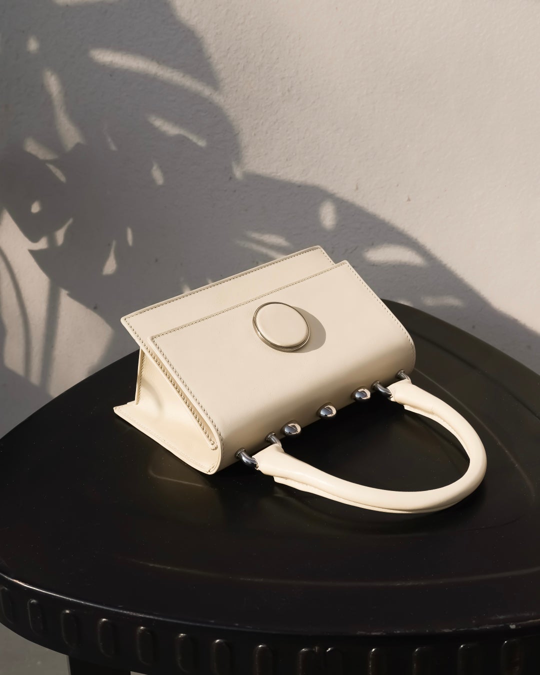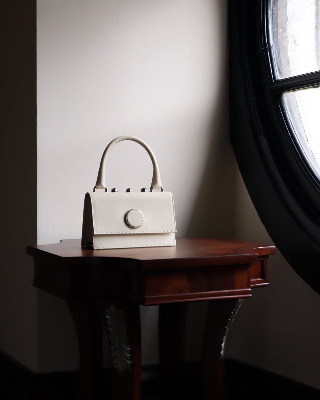 LWG認証を受けたスムースなイタリアンレザーを使用し、コンパクトなシルエットがラグジュアリーな質感と高い耐久性を兼ね備えています。ブラック、ホワイト、ベージュの洗練されたカラーバリエーションで展開され、ミニマルなエレガンスの時代を超えた美しさとモダンな建築デザインの要素を取り入れています。アイコニックなアクセサリーとして、存在感を放ち、持つ人のスタイルを際立たせながら、素材の純粋さとフォルムの現代性とのコントラストを生み出します。