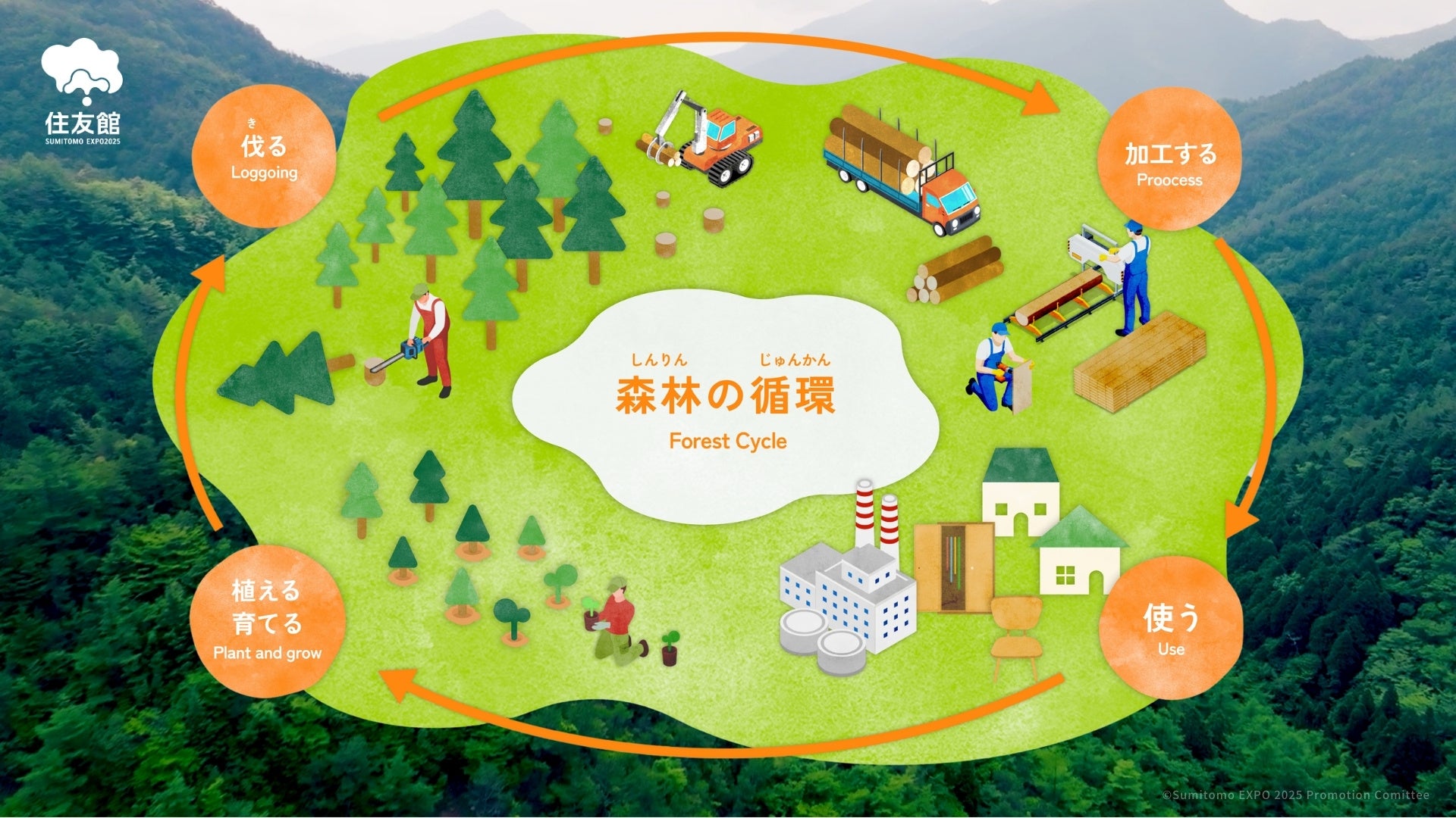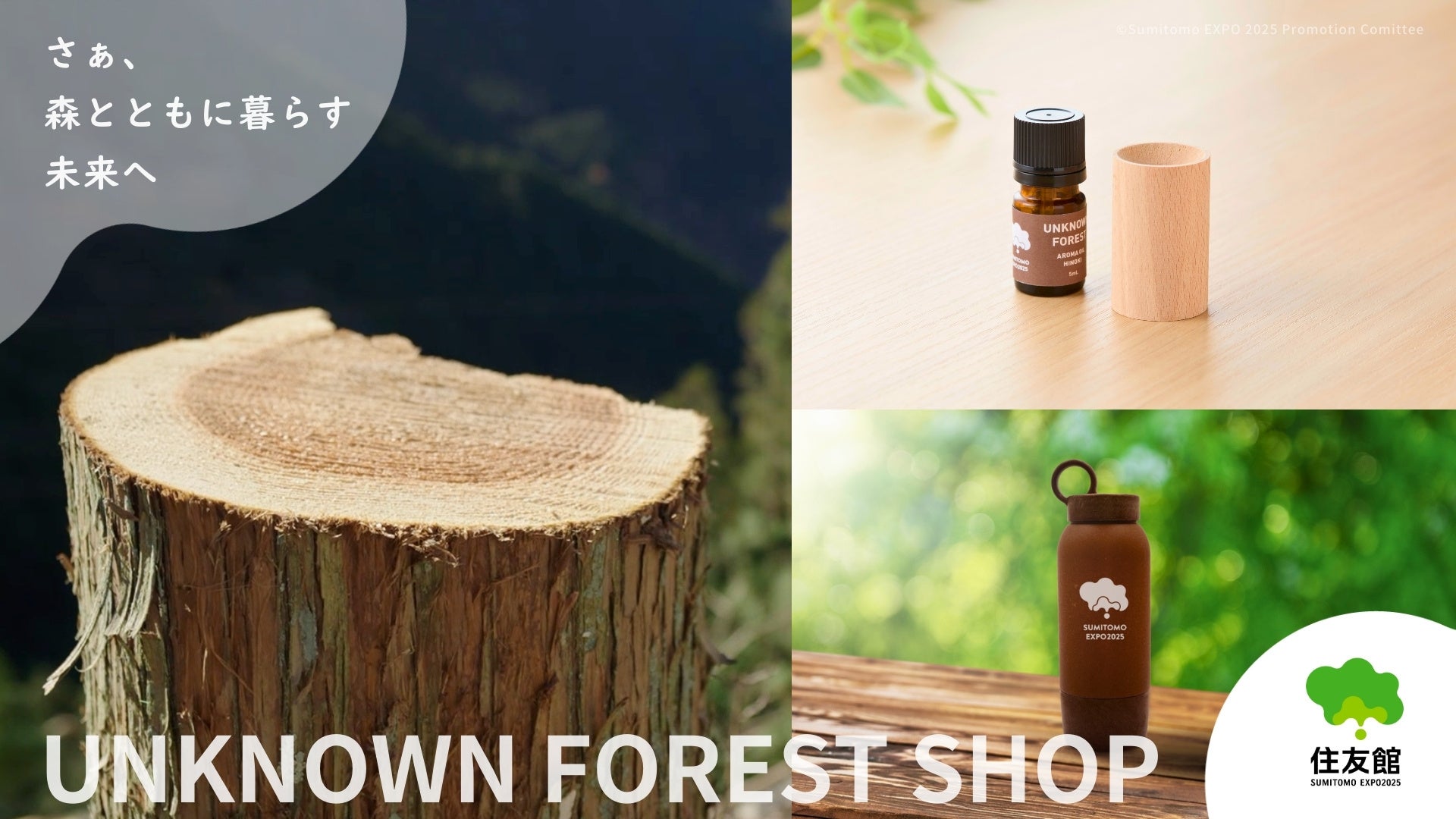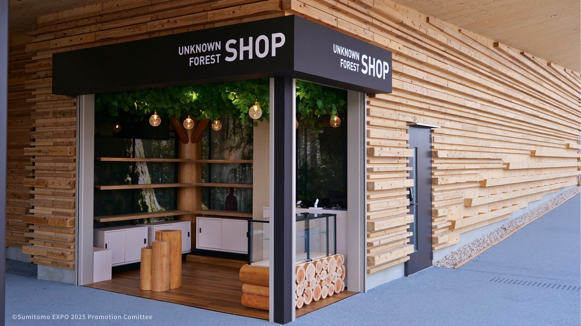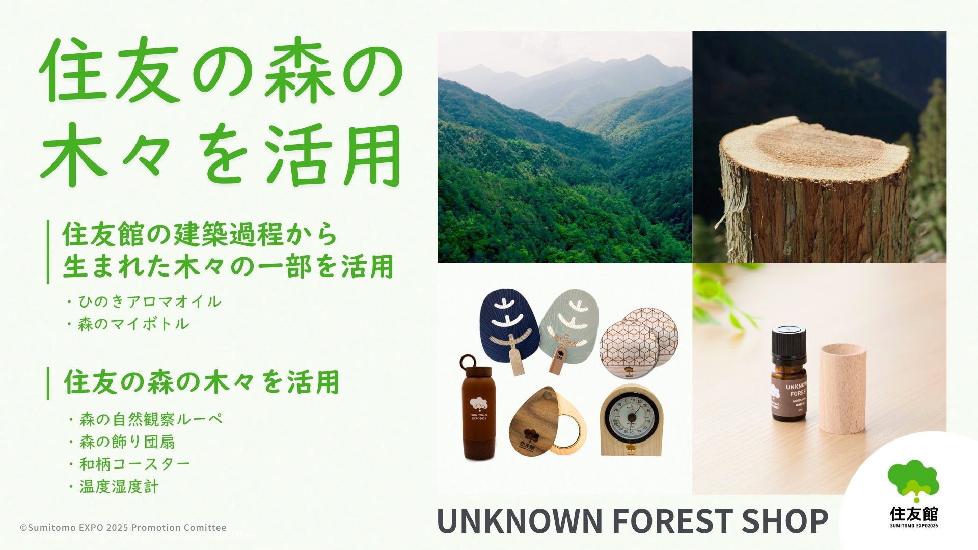 「住友の森」は、400年の歴史を持つ住友グループが数世紀に渡って大切にし、育んできた特別な森です。先人たちが植え、守り、活用し、次世代へと受け継いできた住友の森の木々を、住友館の建築[TK1] [昭高2] 用木材として活用するだけでなく、住友館オフィシャルグッズとしても活用。住友館現地「UNKNOWN FOREST SHOP」で販売されます。