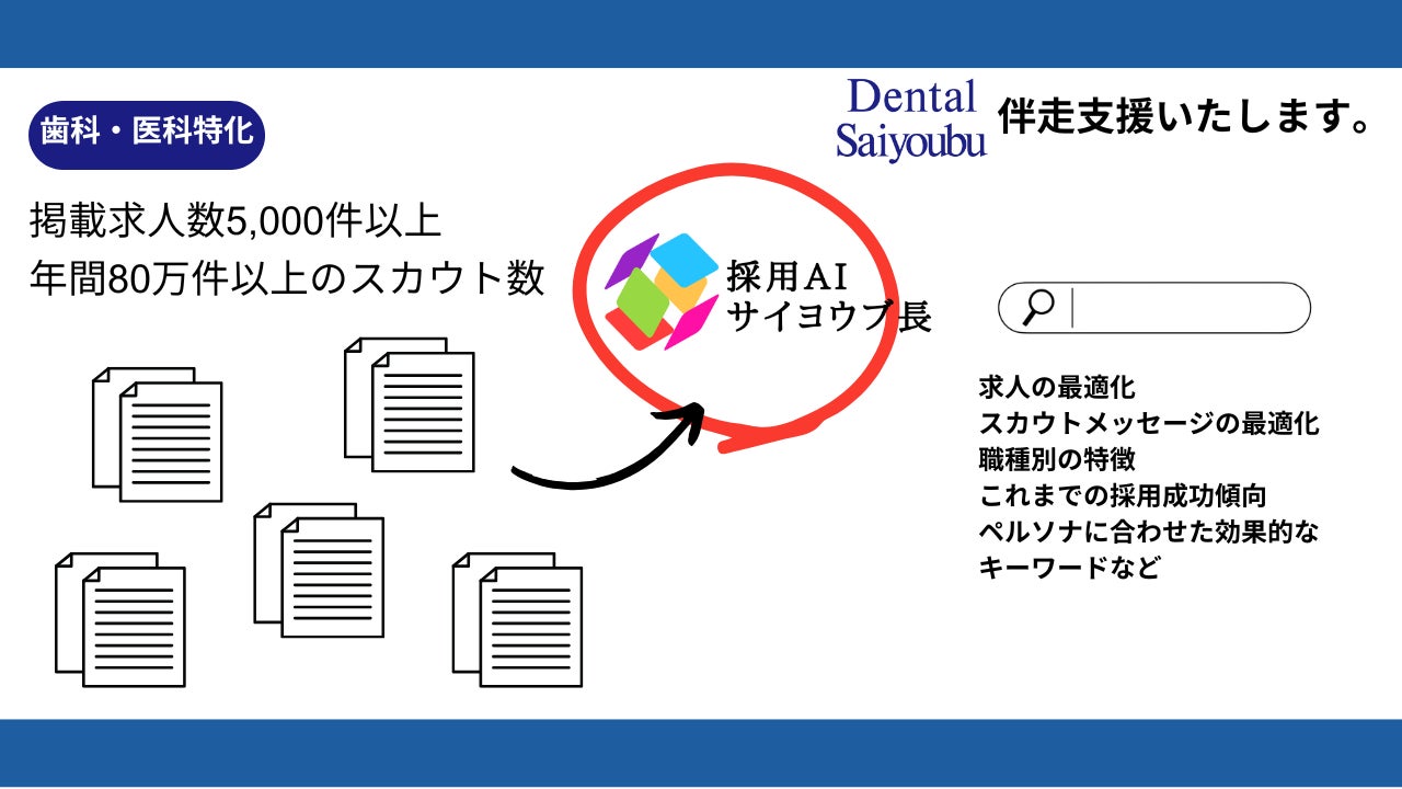 サイヨウブは歯科・医科・介護・美容・保育と、人手不足が課題とあげられる業界で、「攻めの採用活動」の姿勢で採用成功に向けた採用代行支援を行っています。 その採用成功をつきつめる中で、それぞれ業界特有のペルソナ設定、専門的で複雑化する業務内容や給与形態、業界用語を駆使して魅力的な求人やスカウトメッセージの作成が必要というところに着目しました。 そして、募集・採用に特化した”採用AI”を独自に生成し、「サイヨウブ長」と名付けました。