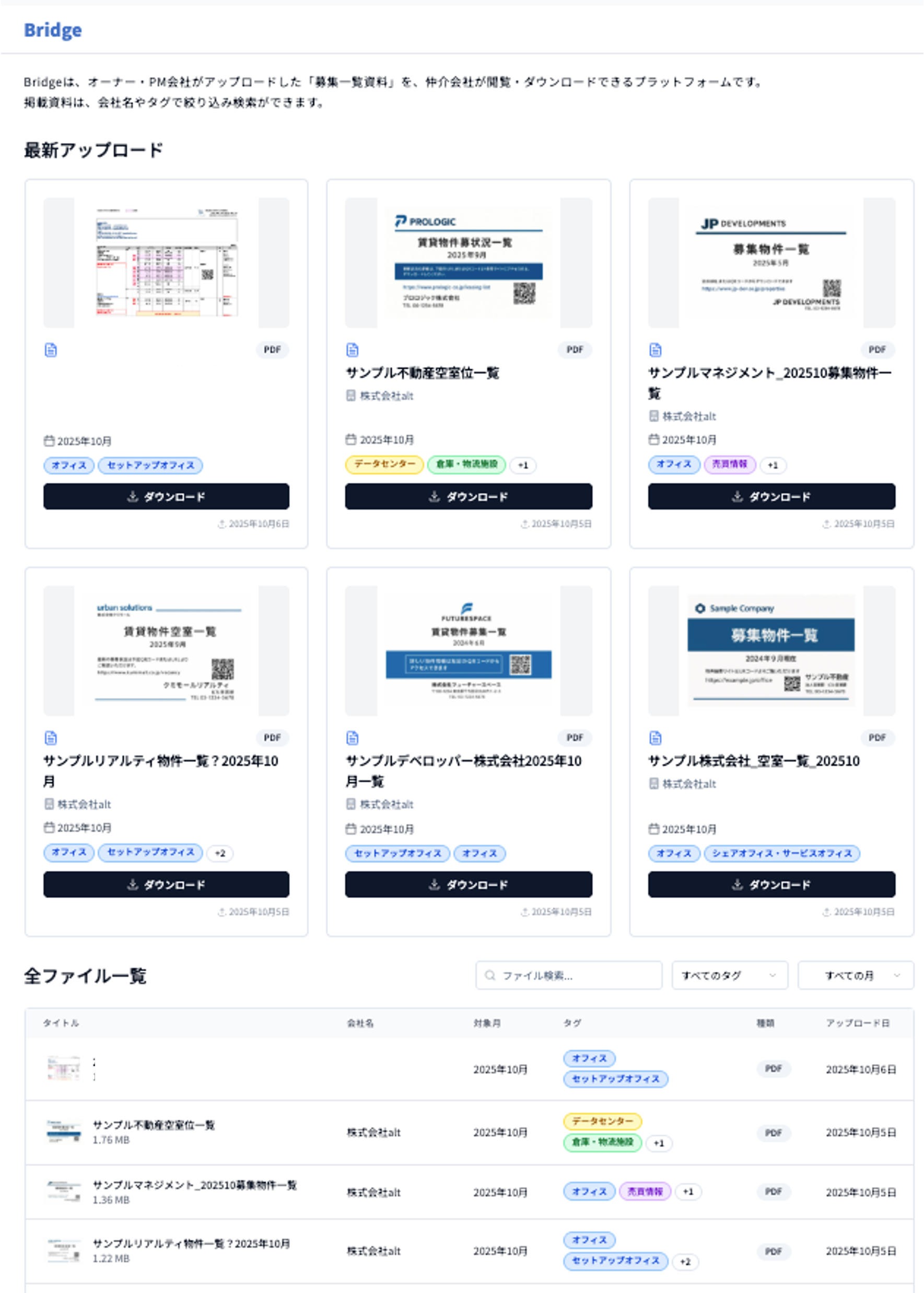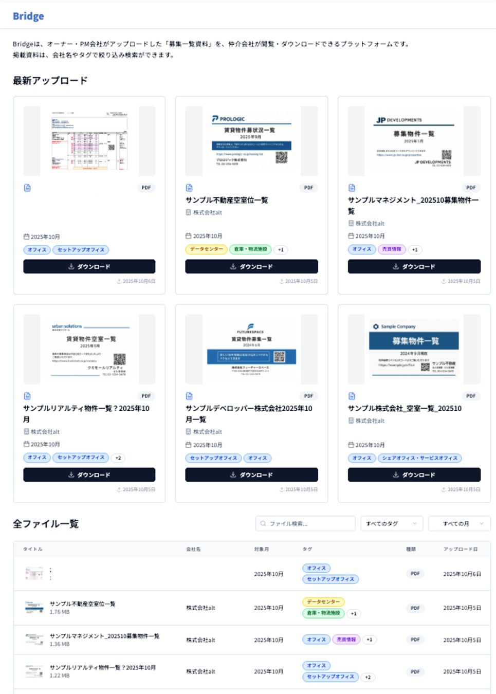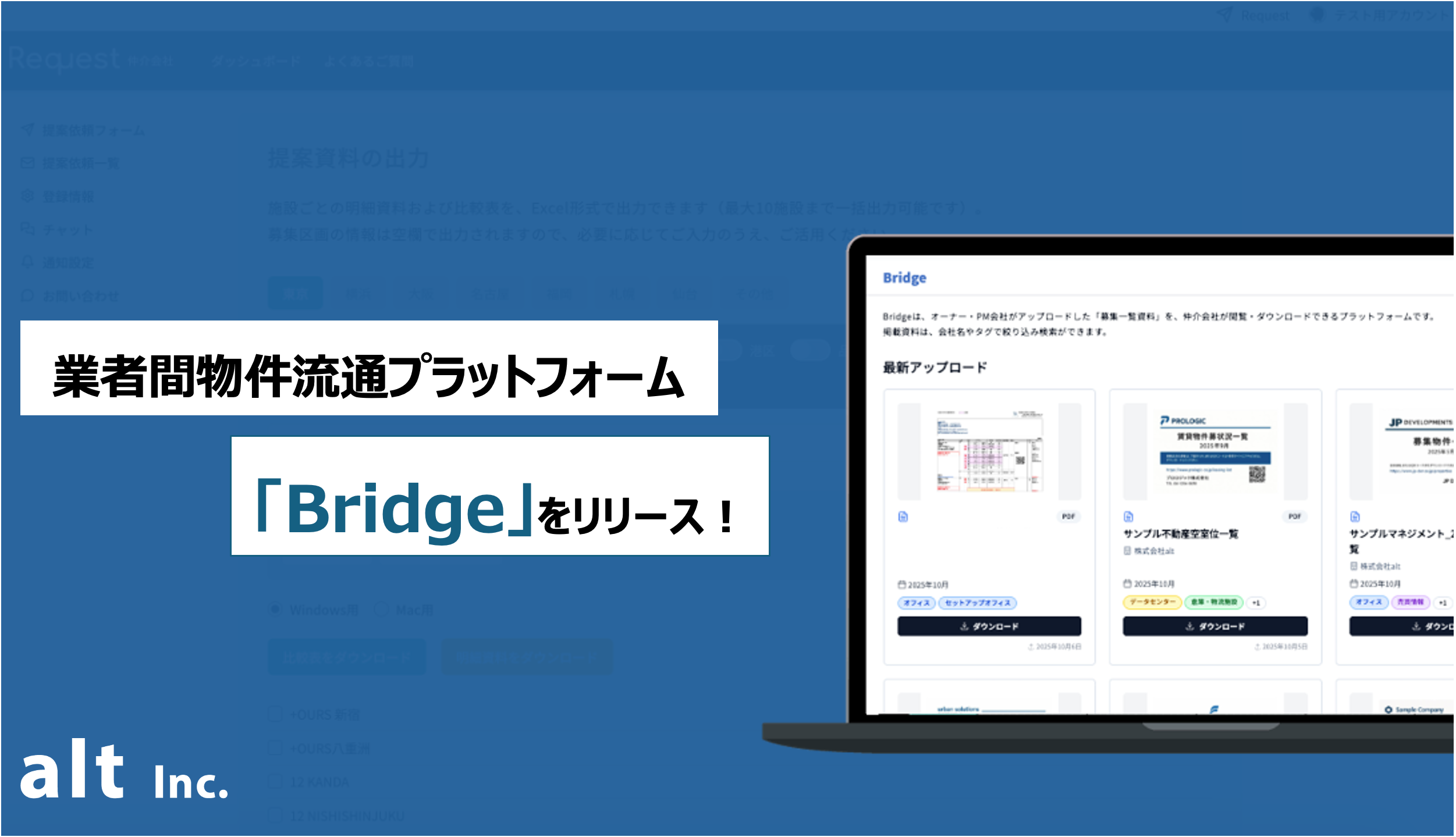 株式会社alt(本社:東京都渋谷区、代表取締役:石原一樹)は、不動産デベロッパーやプロパティマネジメント会社が自社の募集一覧を効率的に共有できる業者間物件流通プラットフォーム「Bridge(ブリッジ)」をリリースしました。