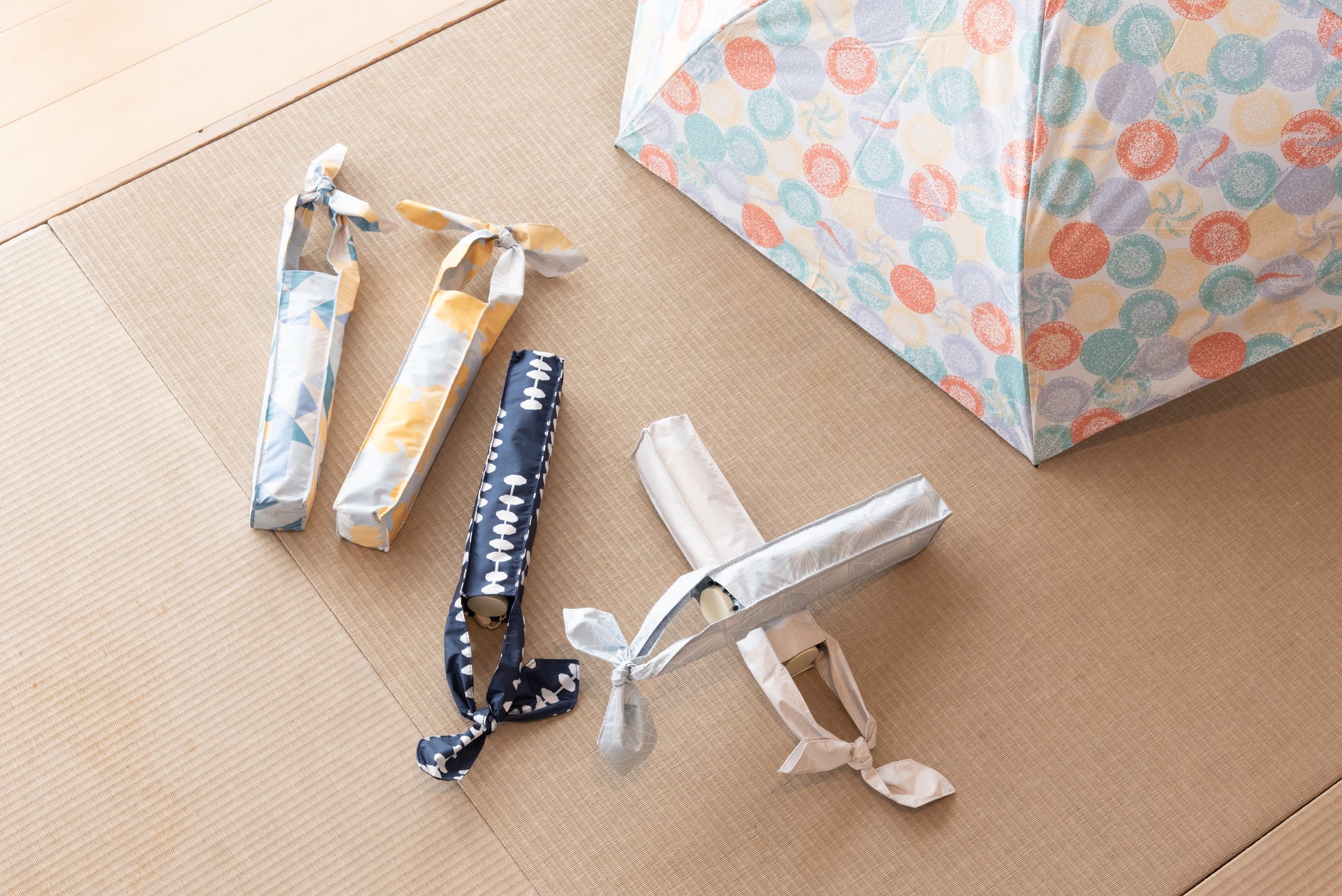 デイリーユースしやすい型でありながら、収納袋は河馬印本舗らしく和のテイストを感じる、遊び心あふれる形になっています。スリムタイプの収納袋は風呂敷をイメージし、結び目を解き自由に結び直すことで、バッグの持ち手などに簡単に取り付けることができます。コンパクトタイプは巾着型のころんとした形が可愛らしい収納袋。大きく間口が広がるので、傘を使用後軽く畳むだけでも、さっと収納することができます。