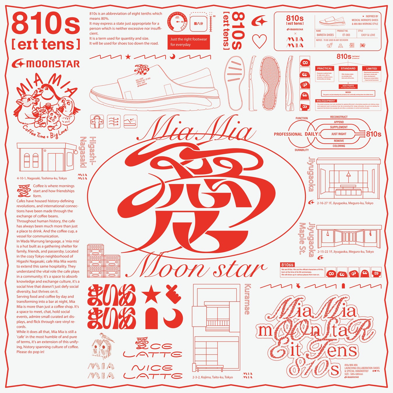 「810s(エイトテンス)」は、1873年創業の老舗シューズメーカー「ムーンスター」が展開する、専門分野(プロユース)で培った靴作りのノウハウを日々に”ちょうどいい”機能性とデザインに再構築したプロダクトライン。同コラボレーションでは、日常に寄り添う機能性シューズ「HOSP(ホスプ)」をベースに、MIA MIAならではのエッセンスを注いだ、オリジナルバリスタシューズを製作した。