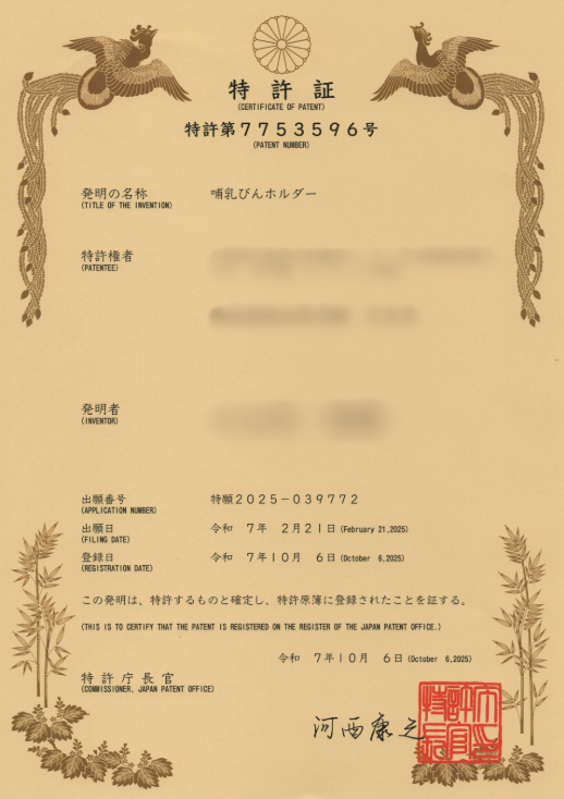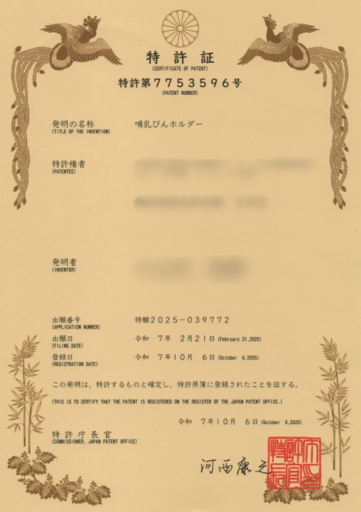 株式会社GROW VAS(所在地:大阪府大阪市)は、赤ちゃんが自ら飲みやすく、ミルクがこぼれにくい独自構造を採用した「哺乳びんホルダー(哺乳瓶ホルダー)」で 特許第7753596号 を取得しました。本製品は、ハンズフリー授乳をサポートし保護者の負担を軽減するとともに、“セルフミルク飲み”を安全に促すことを目指しています。