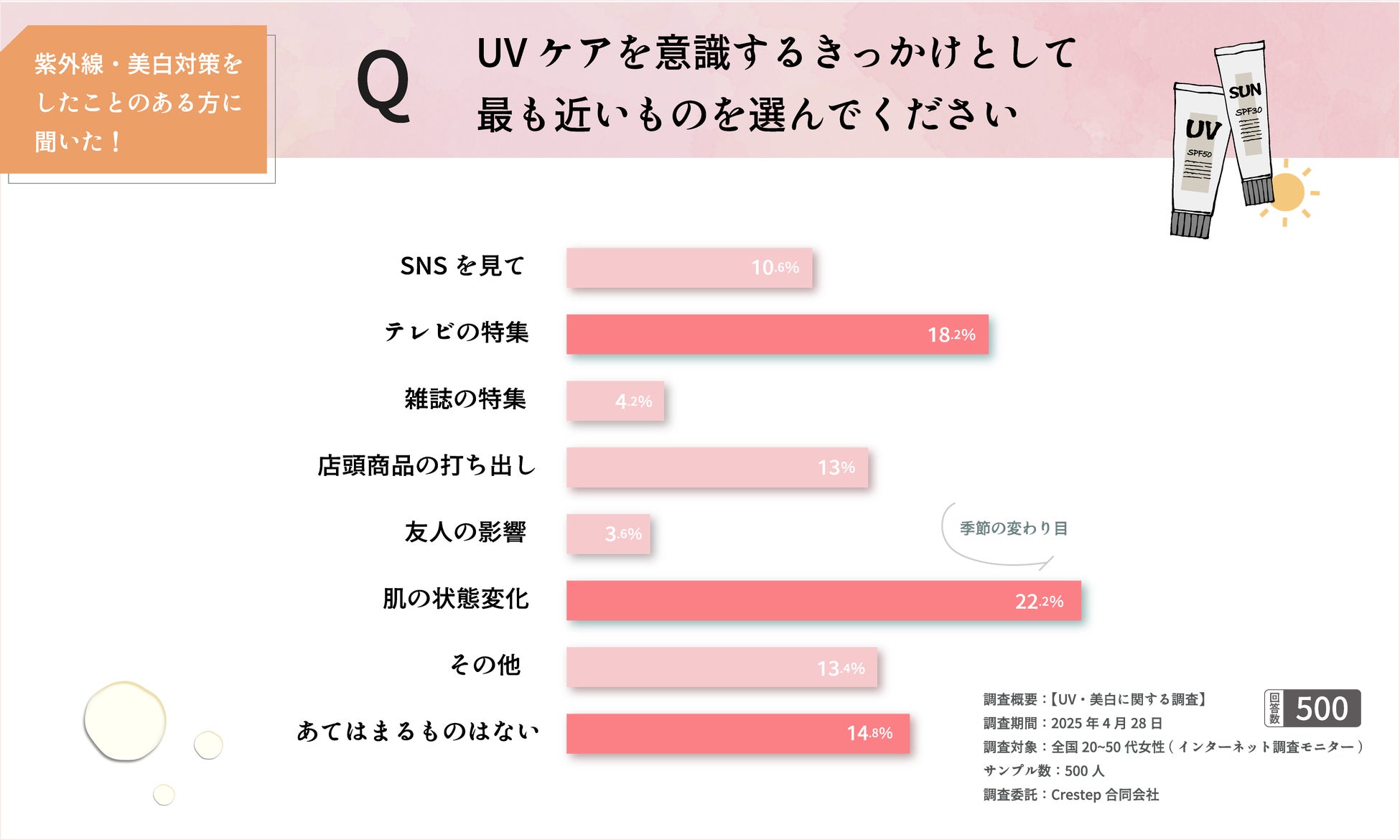 UVケアを意識し始めたきっかけとして最も多かったのは「季節の変わり目」(22.2%)でした。次いで「天気予報で紫外線量を見たとき」(18.2%)、「外出予定があるとき」(14.8%)など、日常の変化や情報がきっかけになるケースが多いようです。