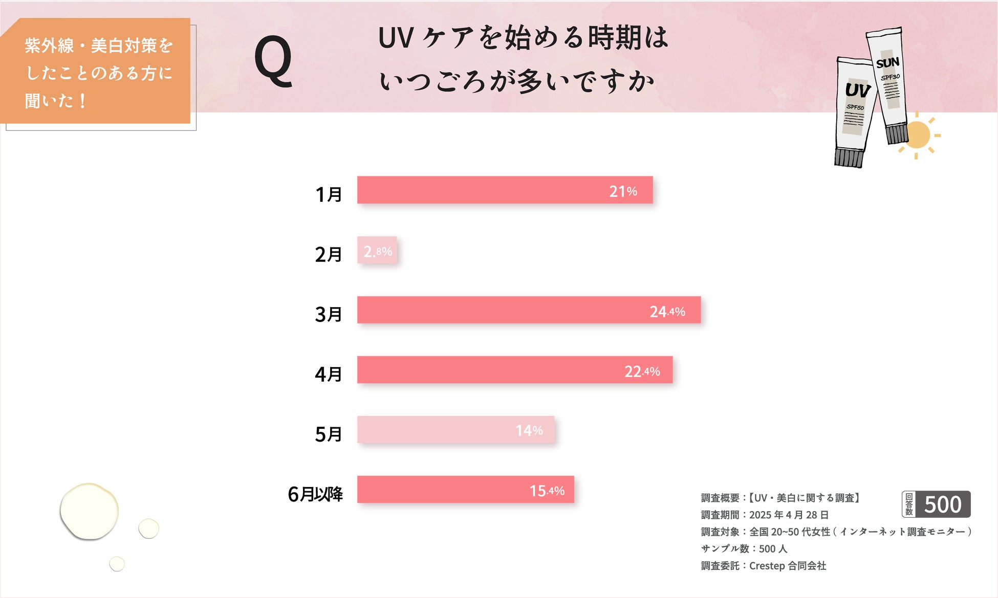 「UVケアを始める時期はいつごろが多いですか?」という質問に対して、最も多かったのは「4月」(24.4%)、次いで「5月」(22.4%)、「3月」(21%)となり、3月〜5月に集中していることがわかりました。梅雨や真夏を迎える前に、すでに多くの人が対策を始めているという実態が明らかになりました。