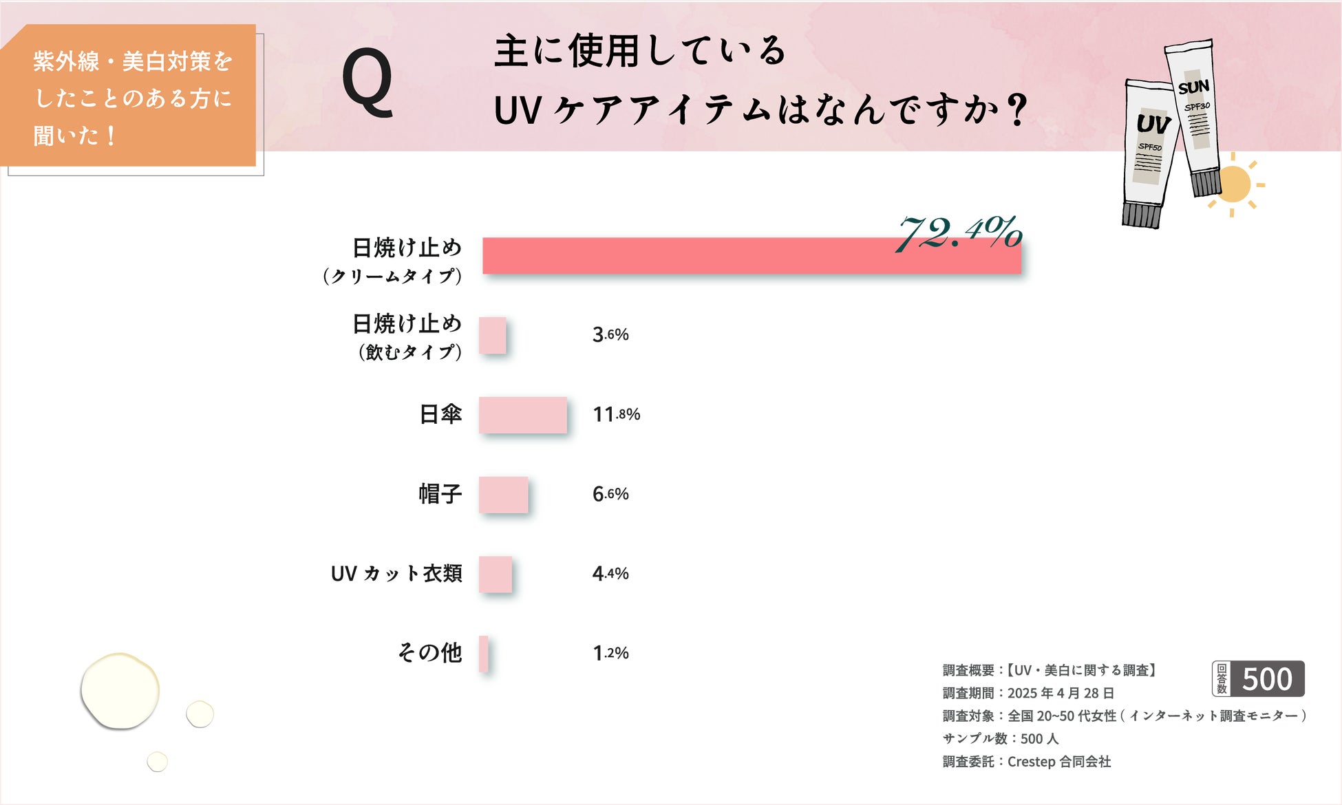 実際に使用しているUVケアアイテムについては、「日焼け止め(クリームタイプ)」が圧倒的に多く、全体の72.4%を占めました。そのほかは「日傘」(11.8%)、「帽子」(6.9%)、「UVカット衣類」(4.4%)などが続きました。