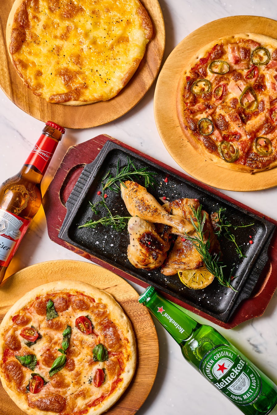 「チキングリルプレート」は、骨付きチキンを数種のハーブに漬け込み、じっくりと調理することで皮はパリッと、中はしっとりジューシーに仕上げました。「ピザ」は、高温で一気に焼き上げ、外はパリパリ、中はふんわり。自家製の濃厚トマトソースと、厳選した数種類のチーズなど、素材にもこだわった一品です。「マルゲリータ」「3種のチーズピザ」「スパイシーミートピザ」よりお好みの一種をお選びください。