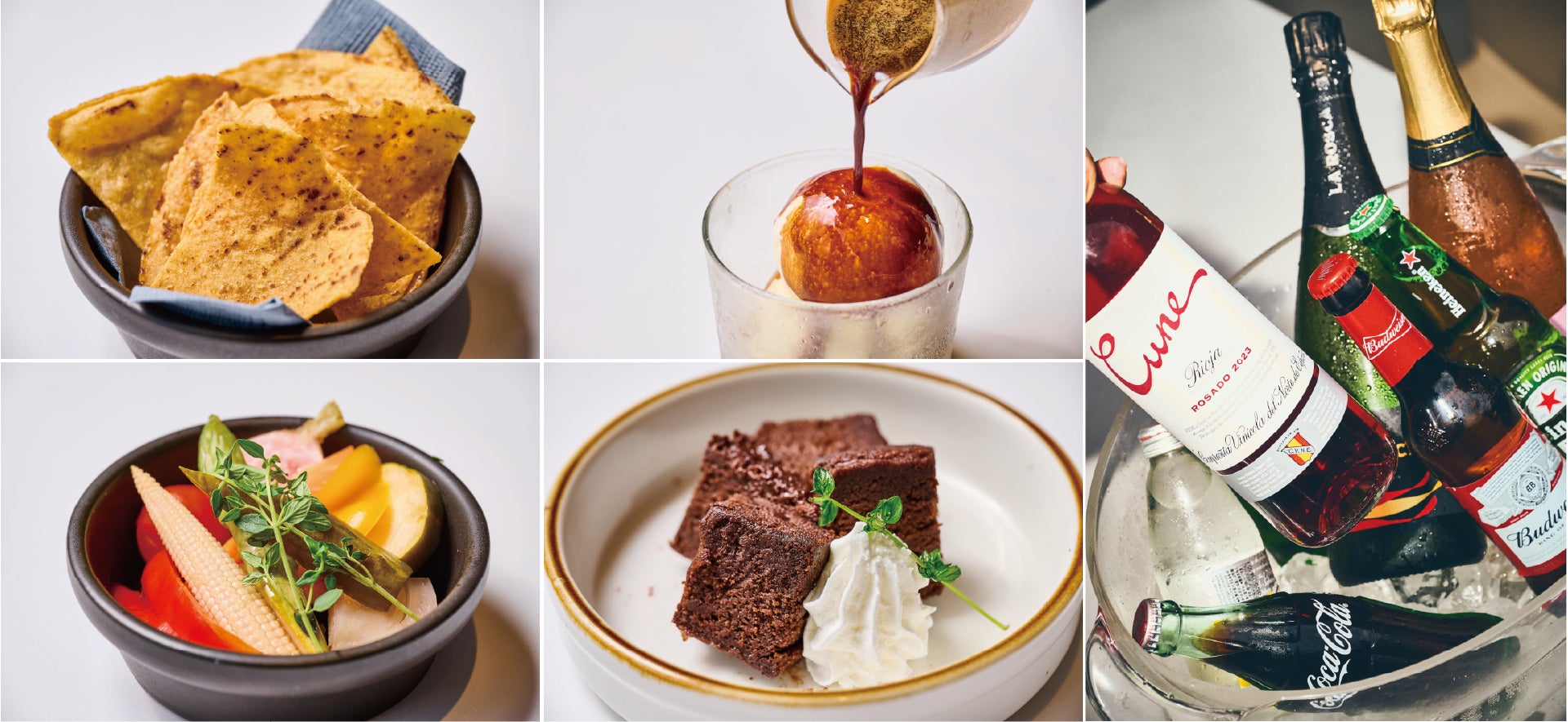 ・ナッツ、トルティーヤチップス、オリーブ、ポップコーン、一口ガトーショコラ、クッキー、マシュマロ、バニラアイス、シャーベット、エスプレッソアフォガード