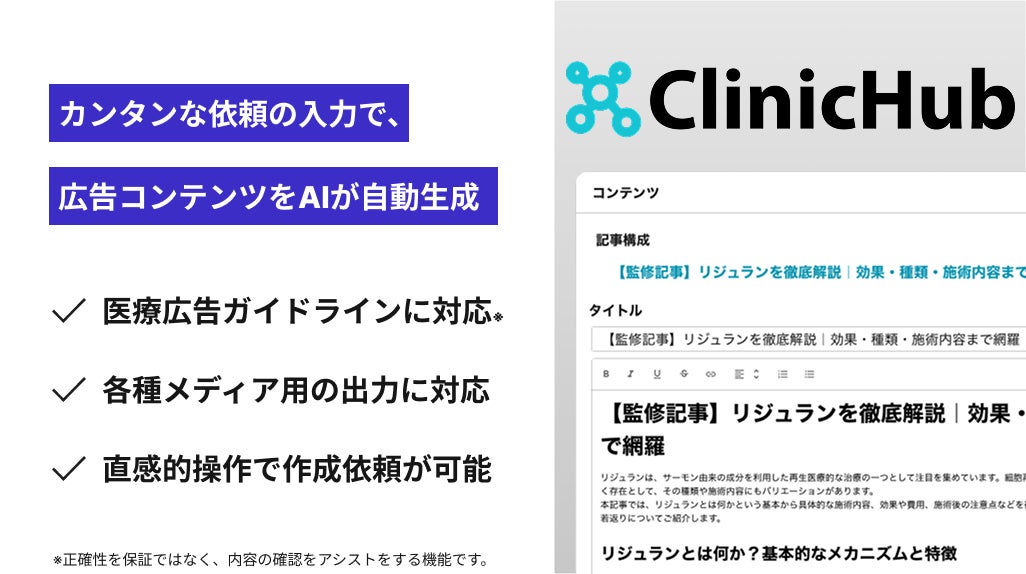 株式会社zapath(本社:東京都渋谷区、代表取締役:四戸淳弘)は、美容医療向けAIエージェント『ClinicHub』において、医療広告ガイドラインへの準拠をサポートする広告コンテンツ自動作成機能の提供を開始いたしました。