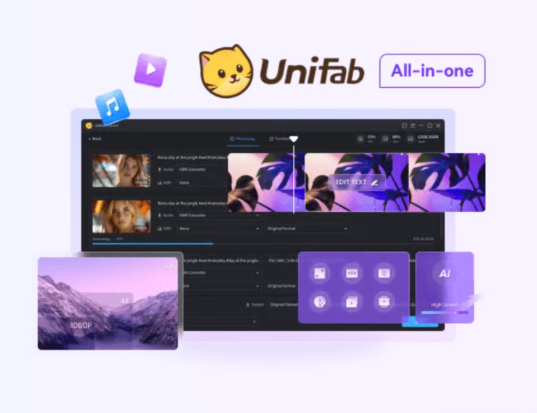 UniFabは、最新なAIモデルを搭載することによって、15種類の動画および音声品質向上ツールを提供する総合的なAIソフトです。低画質な動画をワンステップで4K・8K・16Kにアップグレードできる動画高画質化 AI、SDR動画をHDR画質に変換するHDR 変換 AI、低照度条件などの原因で発生した映像ノイズを除去するノイズ除去 AI、1000以上種類の動画形式を変換、圧縮、編集できる動画変換など、AIを利用して一つのソフトで多様な動画加工機能の提供を可能にします。