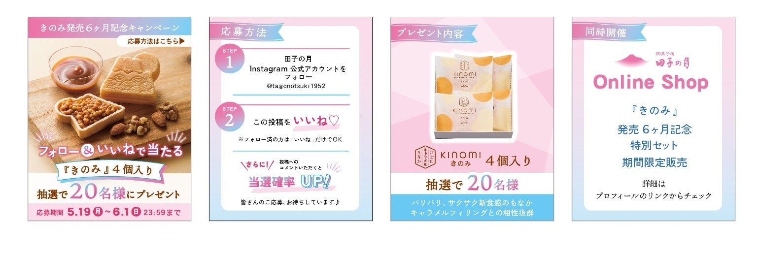 株式会社 田子の月(本社:静岡県富士市今泉380-1、代表取締役社長:牧田 桂輔)は、2024年11月1日に発売以来、ご好評をいただいているネオ和菓子「富士山キャラメルもなか きのみ」の発売6ヶ月を記念して、Instagramでのフォロー&いいね!キャンペーンを本日より開催することを発表いたします。