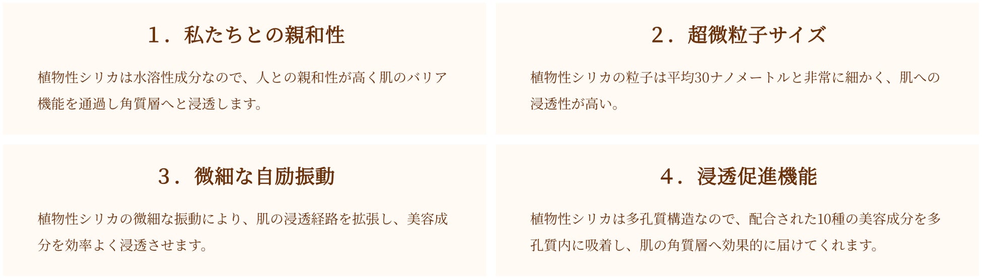 植物性シリカは、超微粒子で、微細な振動により肌への浸透性が高く、異なる成分の安定性を高め、それぞれの成分の効果をさらに活かす力があります。また、多孔質構造のため必要な成分を効率的にトランスポートするなどの働きが詰まっています。