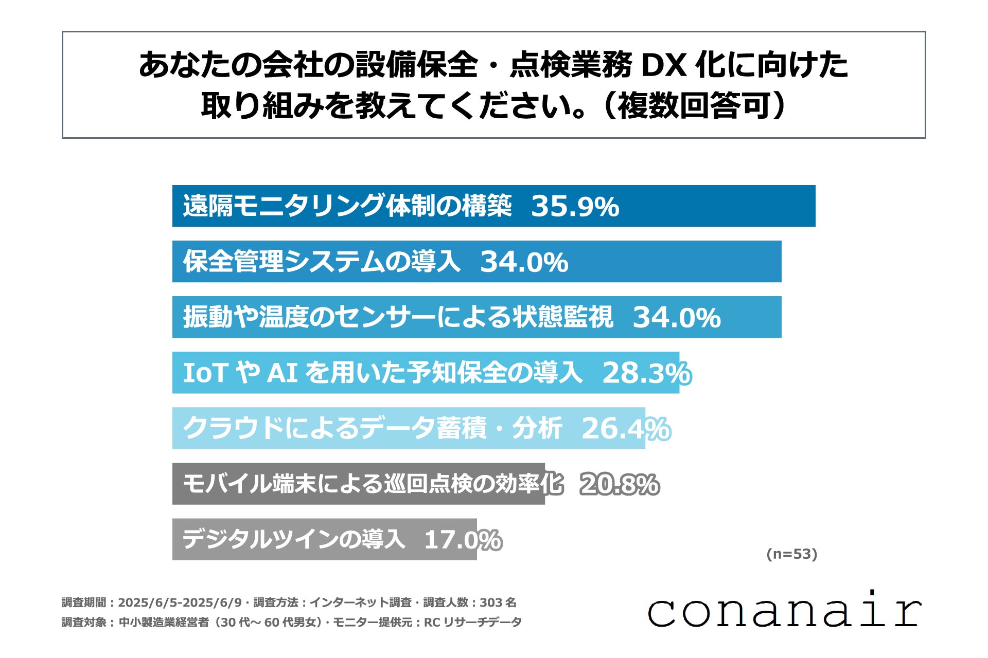 調査の最後、設備保全・点検業務のDX化に取り組んでいる(一部取り組んでいる、積極的に取り組んでいる)と回答された人を対象に「設備保全・点検業務DX化に向けた取り組み」を尋ねる設問への回答では、1位が「遠隔モニタリング体制の構築」で35.9%、2位が同率で「保全管理システムの導入」と「振動や温度のセンサーによる状態監視」で34.0%という結果になりました。4位以降も回答率20%以上の回答が複数並ぶことから、設備保全・点検部門の人手不足を感じている中小製造業が設備保全・点検部門のDX化で取り組んでいることは、多岐に渡ることがわかりました。