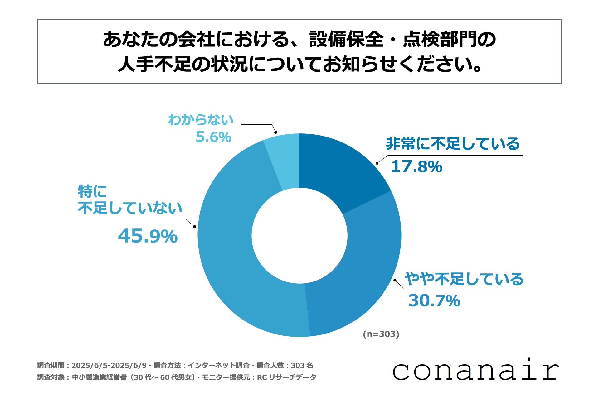 まず、「自身の勤める会社における、設備保全・点検部門の人手不足の状況」を尋ねる設問への回答では、1位が「特に不足していない」で45.9%、2位が「やや不足している」で30.7%、3位が「非常に不足している」で17.8%という結果になりました。「特に不足していない」と回答された人も一定数いるものの、「やや不足している」と「非常に不足している」という回答を合計すると回答率は48.5%となり、中小製造業の5割弱が、設備保全・点検部門で人手不足を感じていることが明らかになりました。