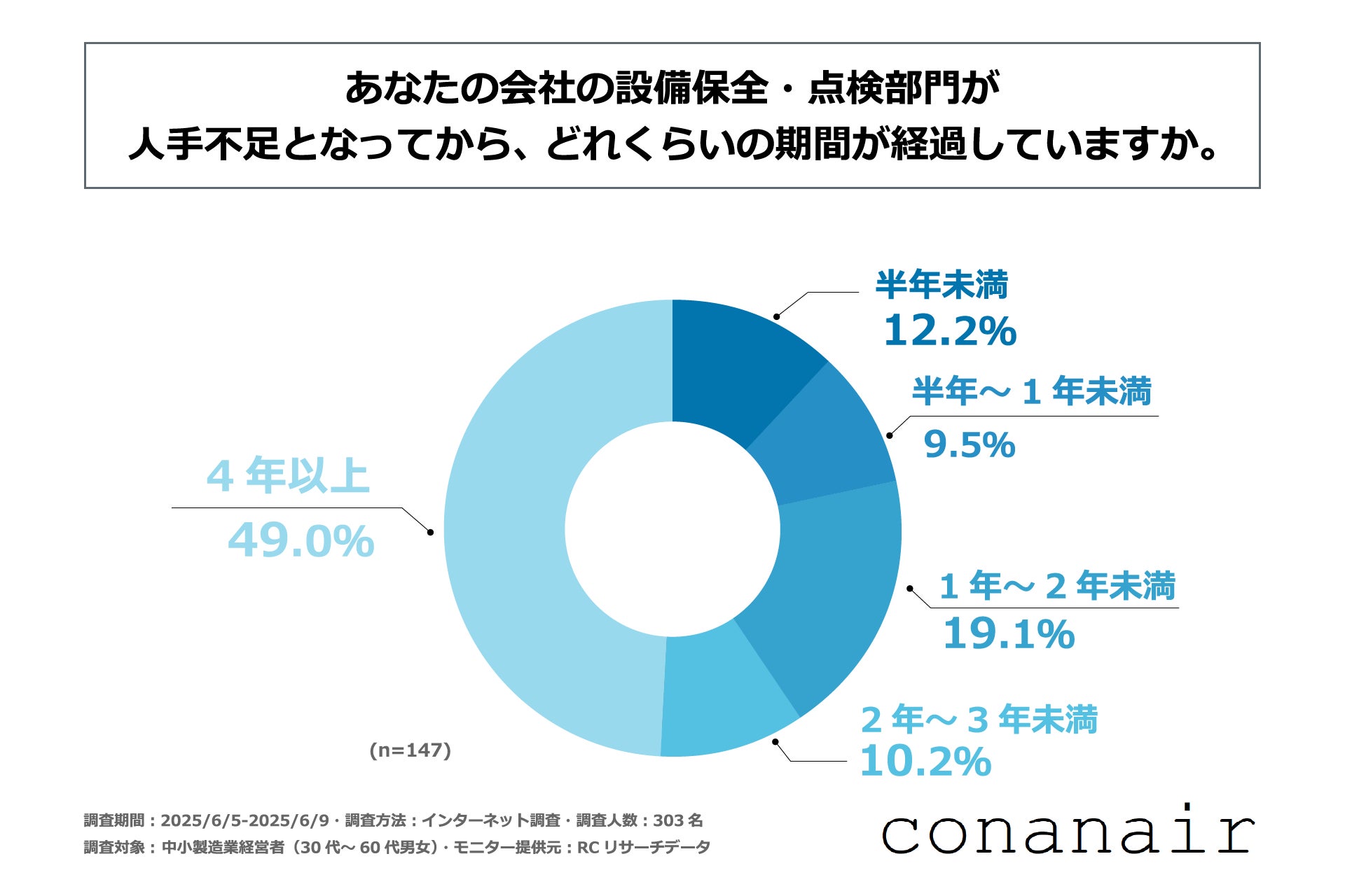 続いて、設備保全・点検部門の人手が不足していると回答した人を対象に「設備保全・点検部門が人手不足となってから、どれくらいの期間が経過しているか」を尋ねる設問への回答では、1位が「4年以上」で49.0%、2位が「1年~2年未満」で19.1%、3位が「半年未満」で12.2%という結果になりました。この結果から、設備保全・点検部門の人手が不足している中小製造業の約5割が、設備保全・点検部門で人手が不足してから「4年以上」経過していることが明らかになりました。