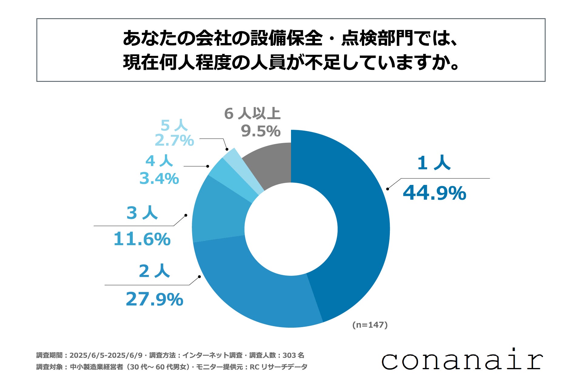 次に、設備保全・点検部門の人手が不足している(やや不足している、非常に不足している)と回答した人を対象に「設備保全・点検部門では、現在何人程度の人員が不足しているか」を尋ねる設問への回答では、1位が「1人」で44.9%、2位が「2人」で27.9%、3位が「3人」で11.6%という結果になりました。この結果から、中小製造業の半数以上が、現在、設備保全・点検部門で「2人以上」人員が不足していることがわかりました。