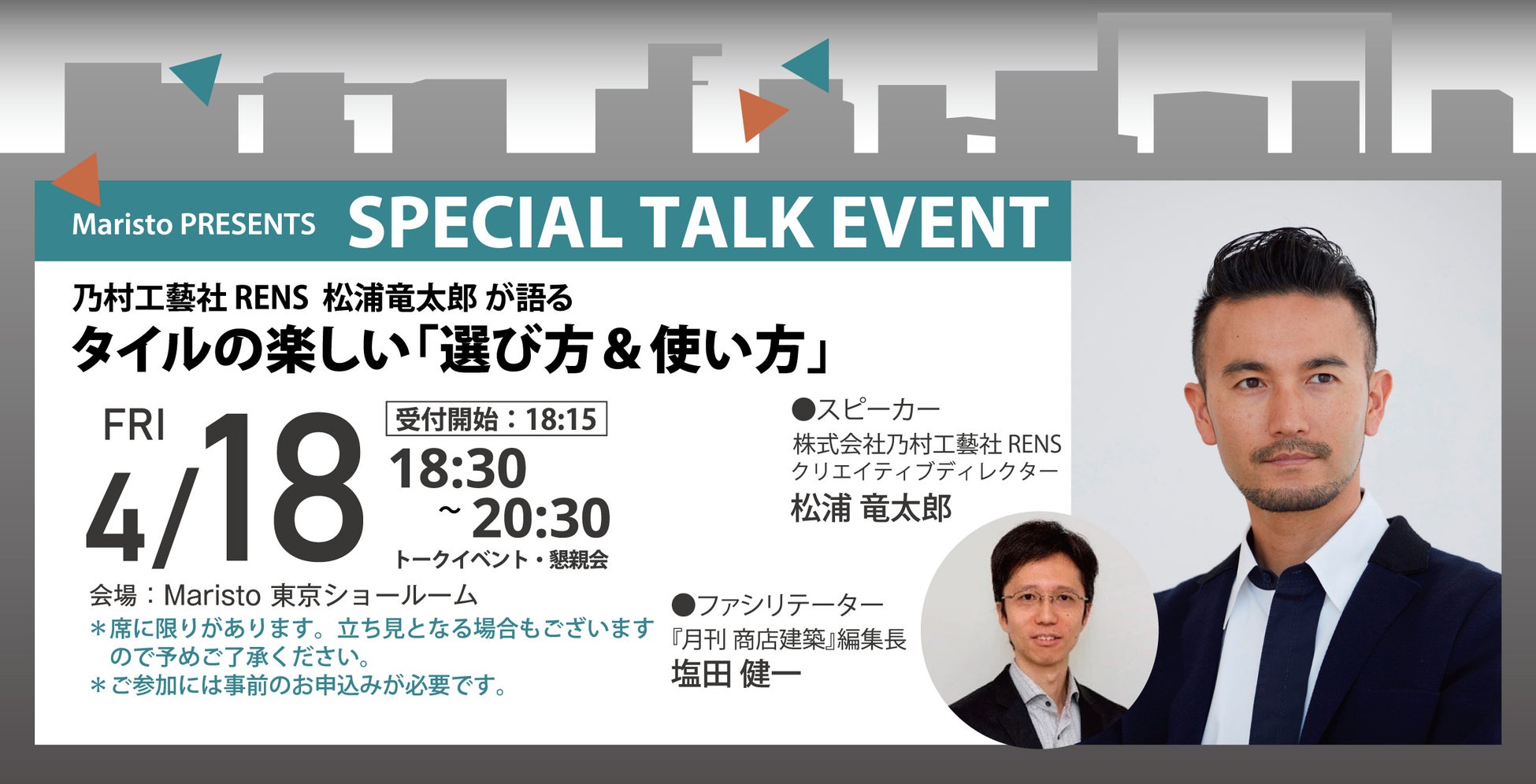 イベント最終日、新ショールームをデザインした 乃村工藝社 RENS の松浦竜太郎様と月刊商店建築編集長の塩田健一様とのトークイベントを開催いたします。
