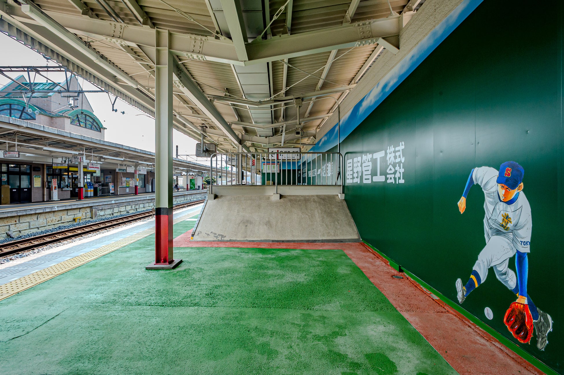 今回の装飾では、2番線ホーム(下り)の壁面全体を外野フェンスに見立てた大胆なデザインが施され、地元企業を中心に30社の広告看板が掲出されることで、まるでプロ野球球場のスタンドにいるかのような臨場感を演出しています。