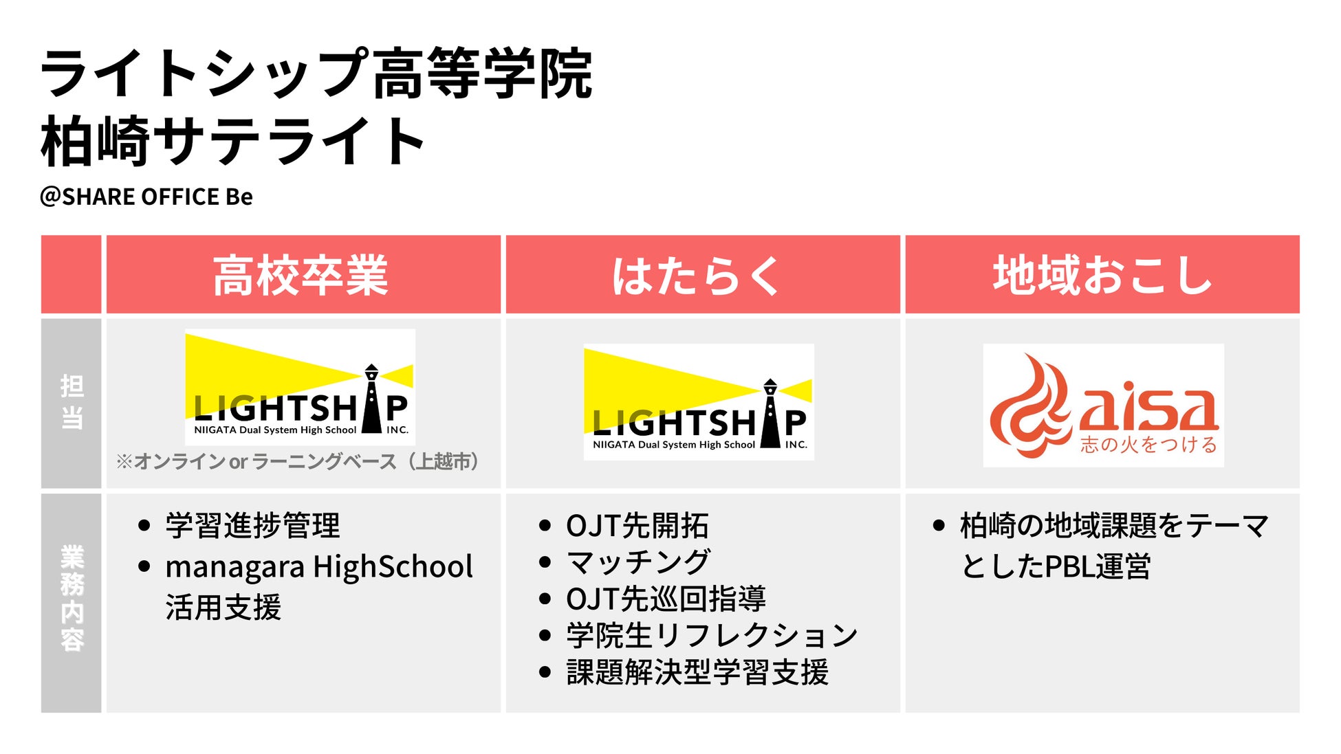 柏崎サテライトに所属する学院生は、週3日程度の柏崎エリア内の企業におけるOJTに取り組む他、柏崎エリアの地域課題をテーマにしたPBLに取り組みます。OJTの運営はライトシップ高等学院のスタッフが担当し、PBLの運営はaisaのスタッフが担当します。